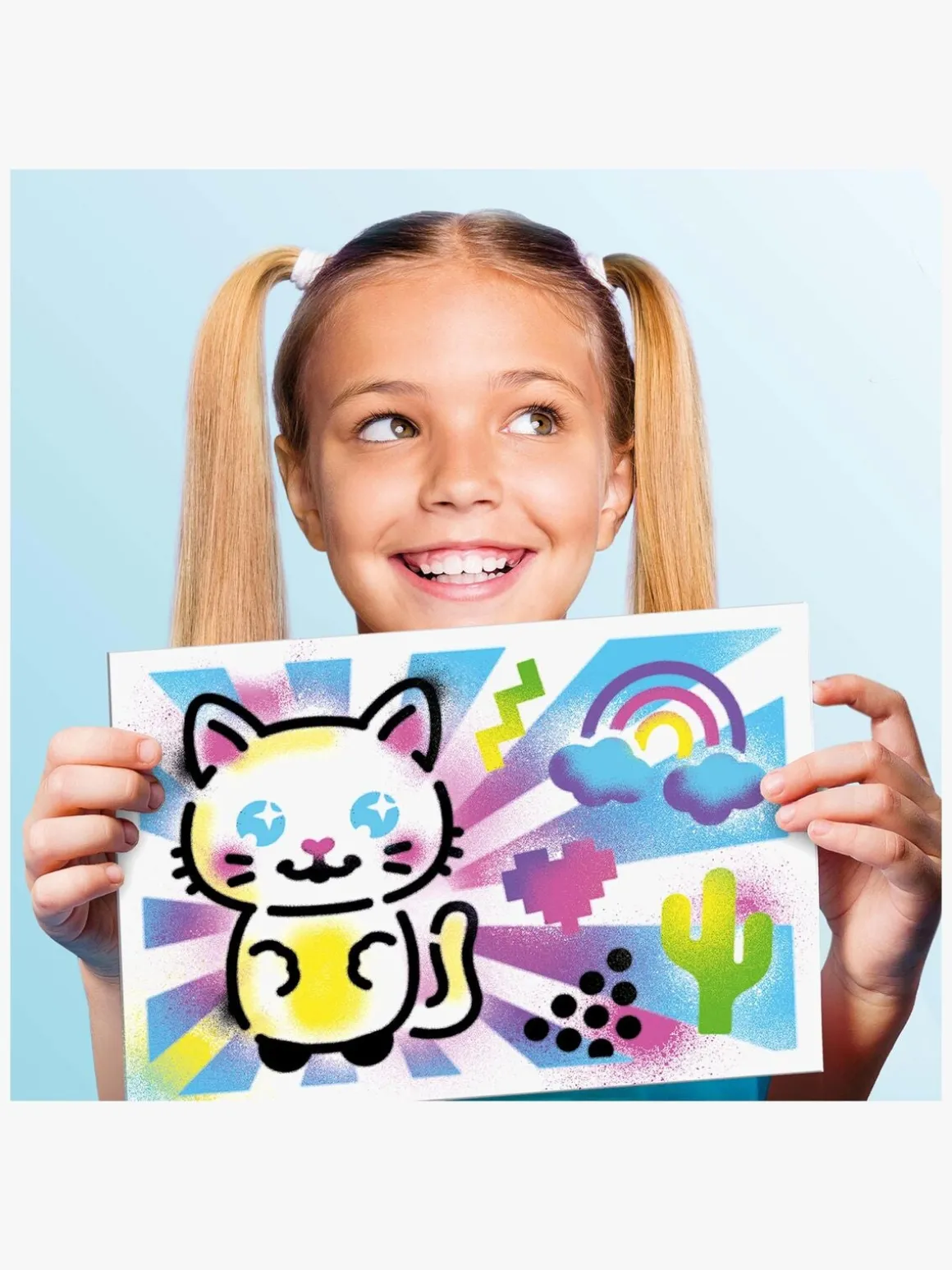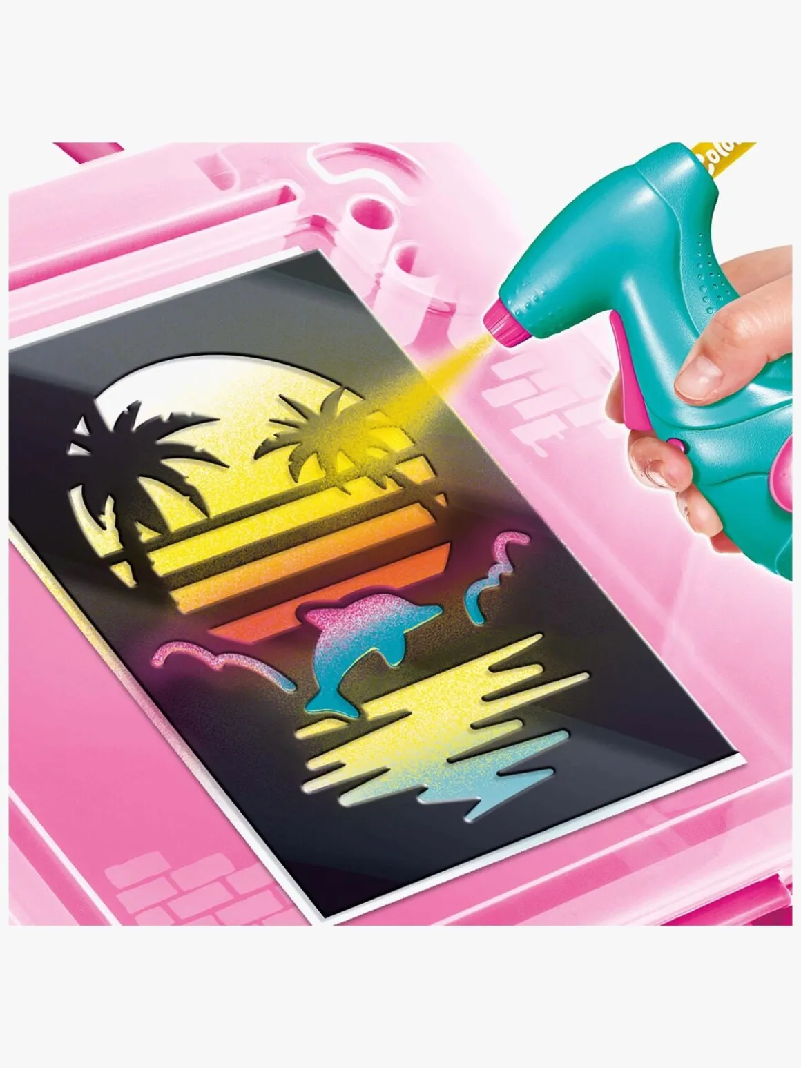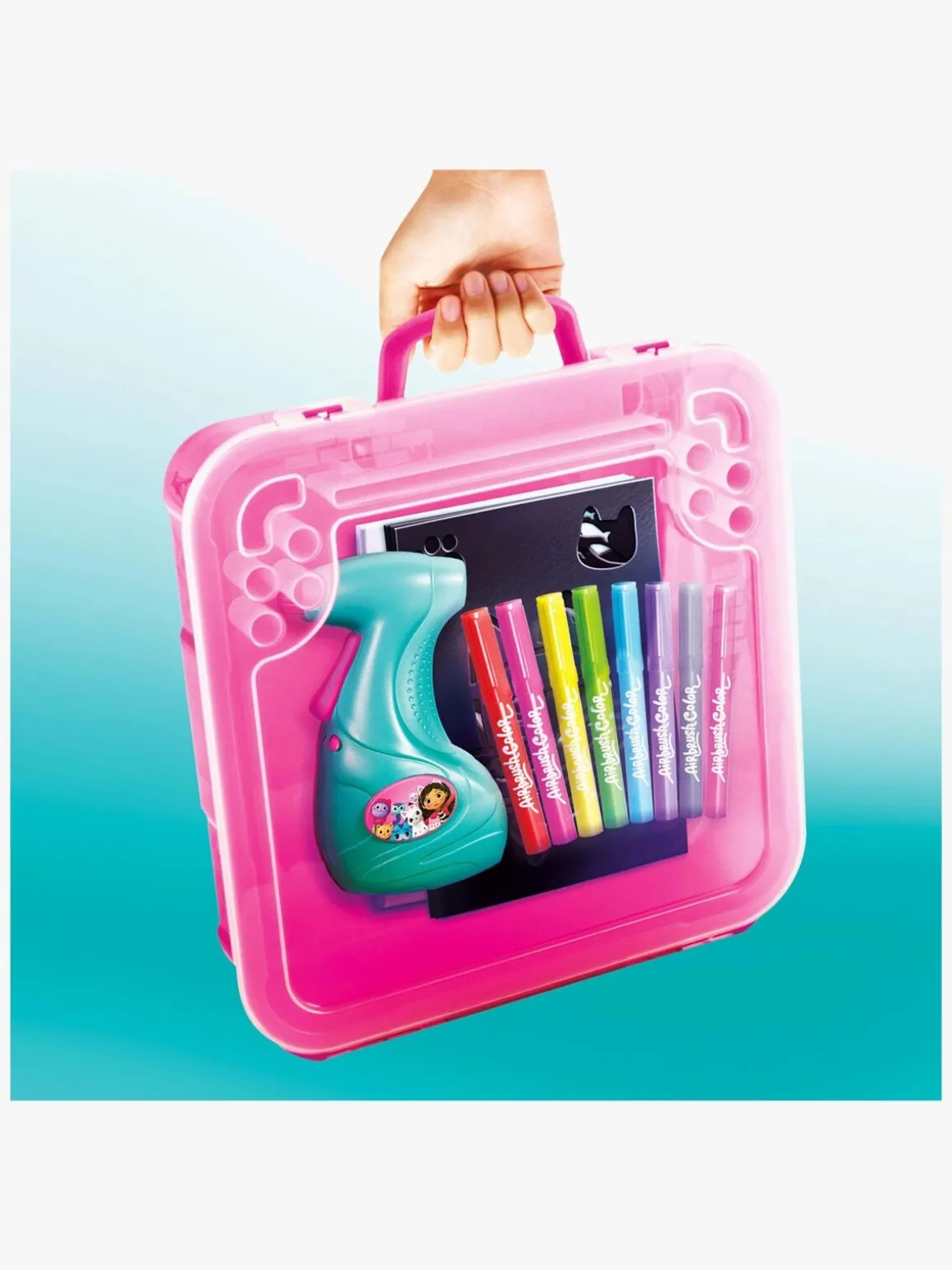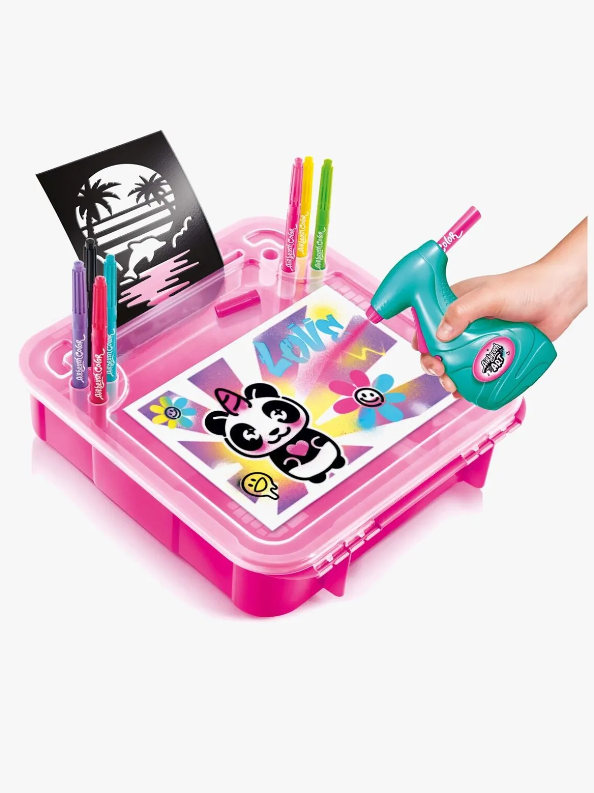 – Indeholder: 1 taske, 1 airbrush, 8 airbrushfarver, 10 stencilskabeloner, 10 papirark, 1 brugsvejledning.