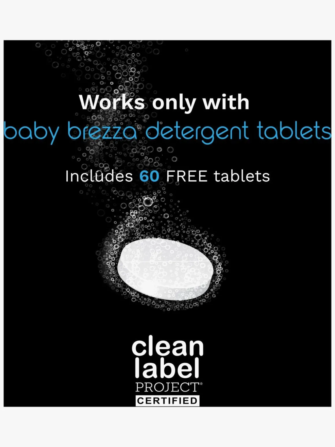 – Kan kun bruges sammen med Baby-Safe Baby Brezza vasketabletter (gratis 60-pak medfølger).
