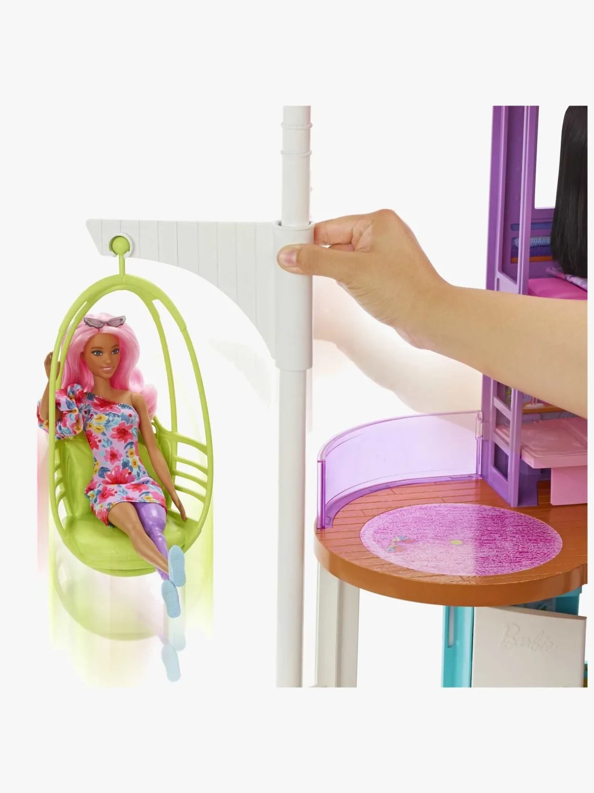 – Indeholder: 1 Barbie-feriehus, 1 gyngestol, 1 sofa, 4 stole, 1 spisebord, 1 lampe og andet tilbehør til fantasifuld leg.