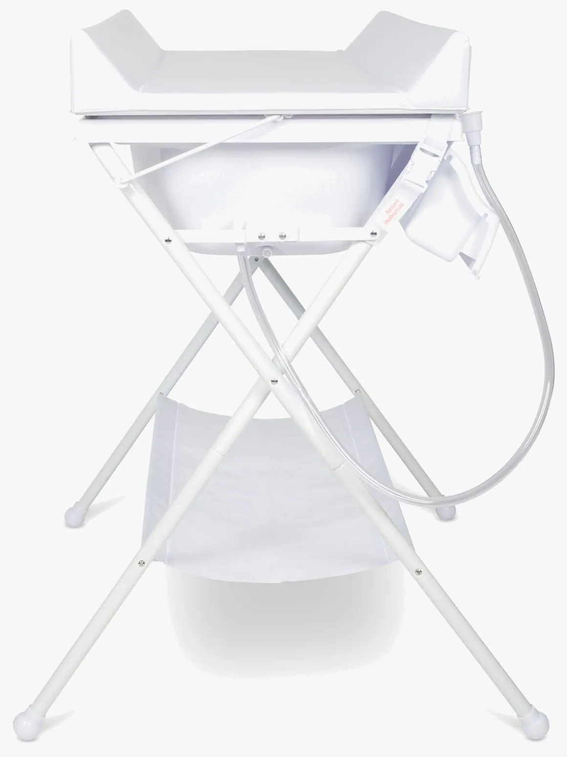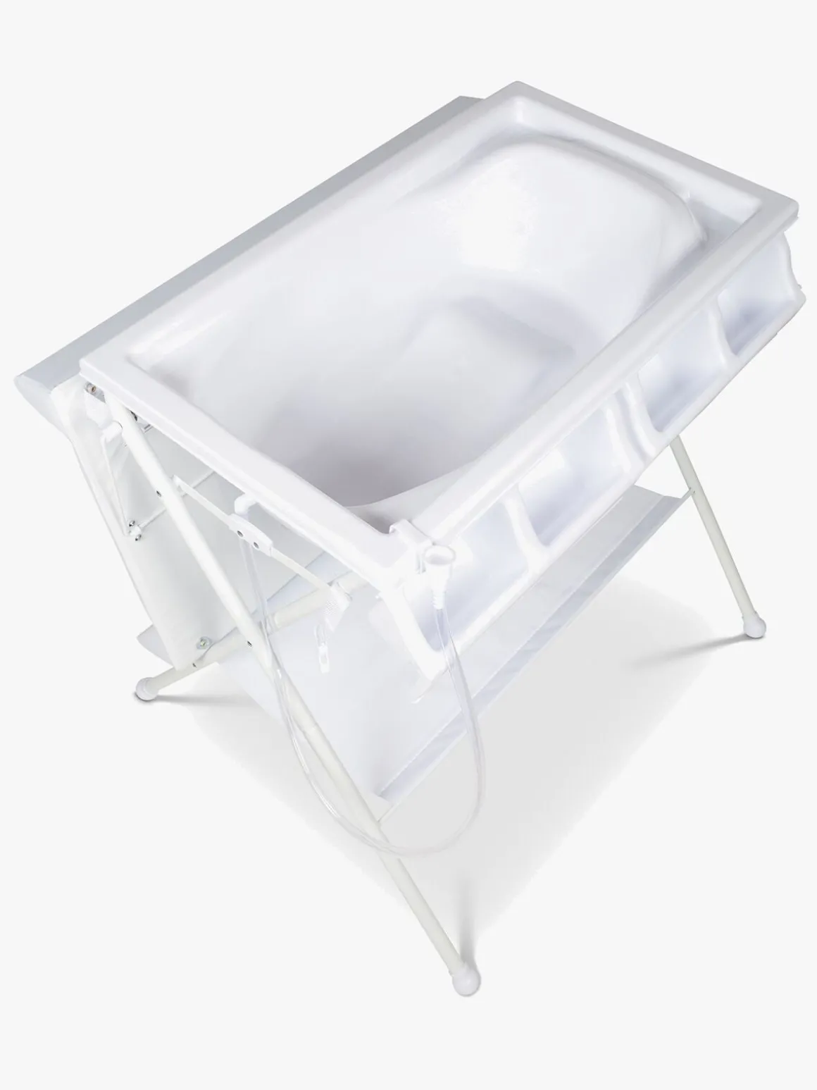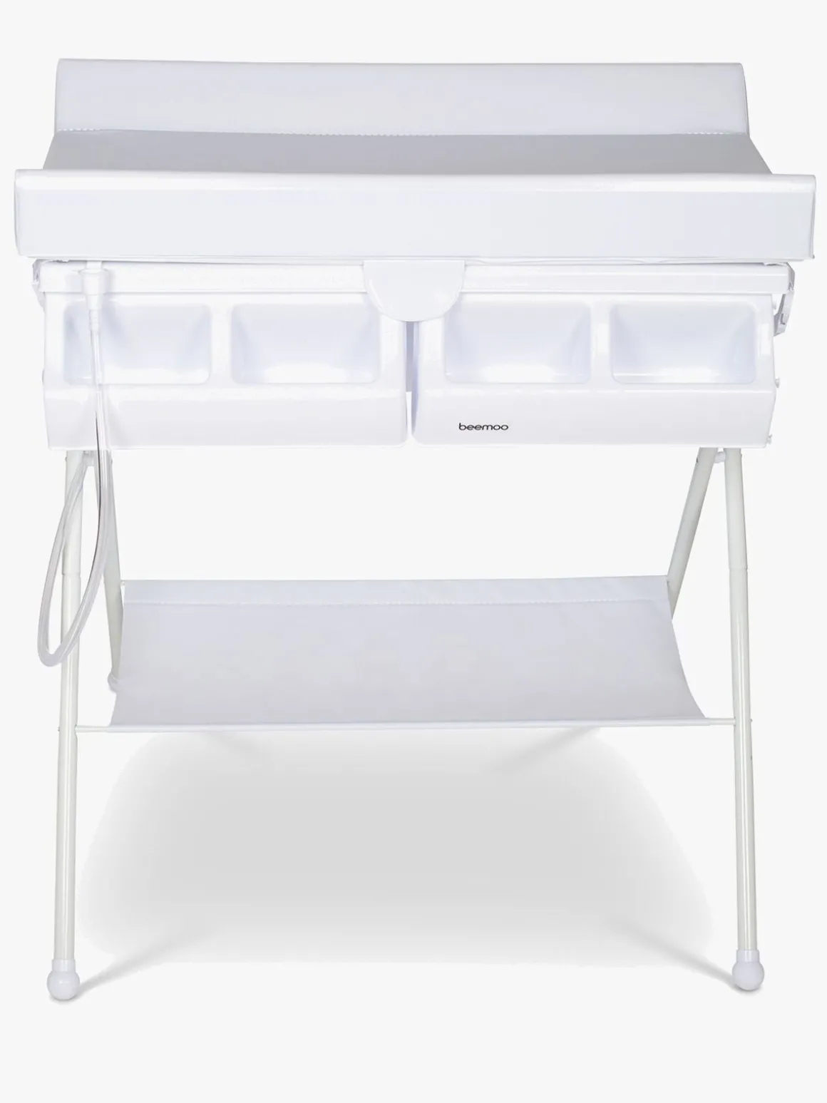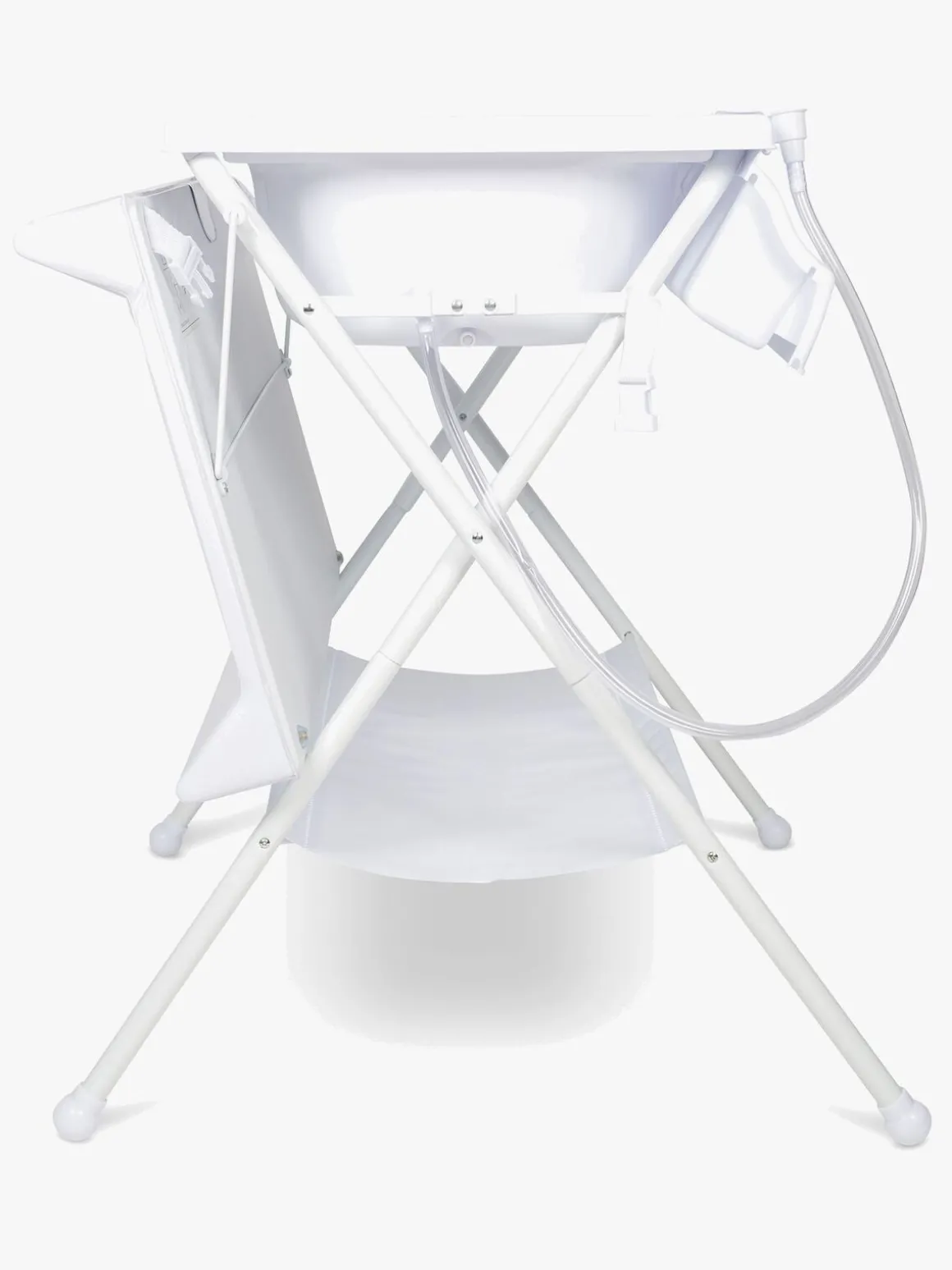 For at få adgang til badebaljen folder man puslepuden ned langs siden af bordet, og efter badet er det bare at tømme badevandet i nærmeste håndvask eller afløb via den medfølgende afløbsslange. På siden af puslebordet er der praktiske lommer til opbevaring af bleer, vaskeservietter tøj og andre nødvendigheder. Under bordet er der en blød hylde med plads til yderligere opbevaring.