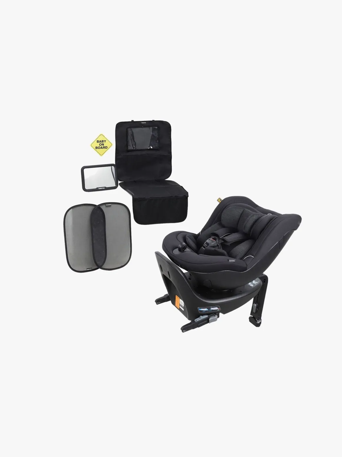 Tilbehørspakken fra Beemoo medfølger. Her får du et bilspejl med et brudsikkert spænde, sædebeskytter i mikrofiber og læder, et ”baby on board”-skilt og solbeskyttelse, der beskytter dit barn mod både varme og solens stråler.