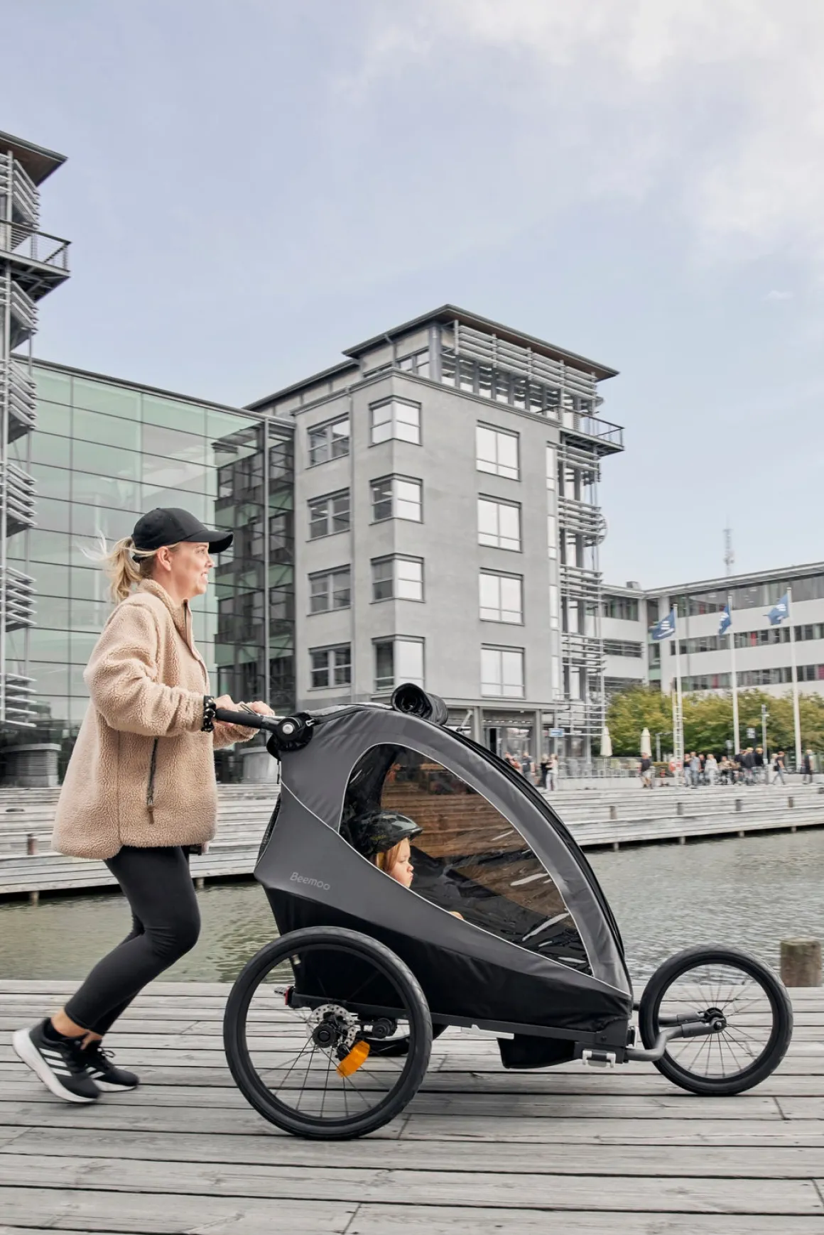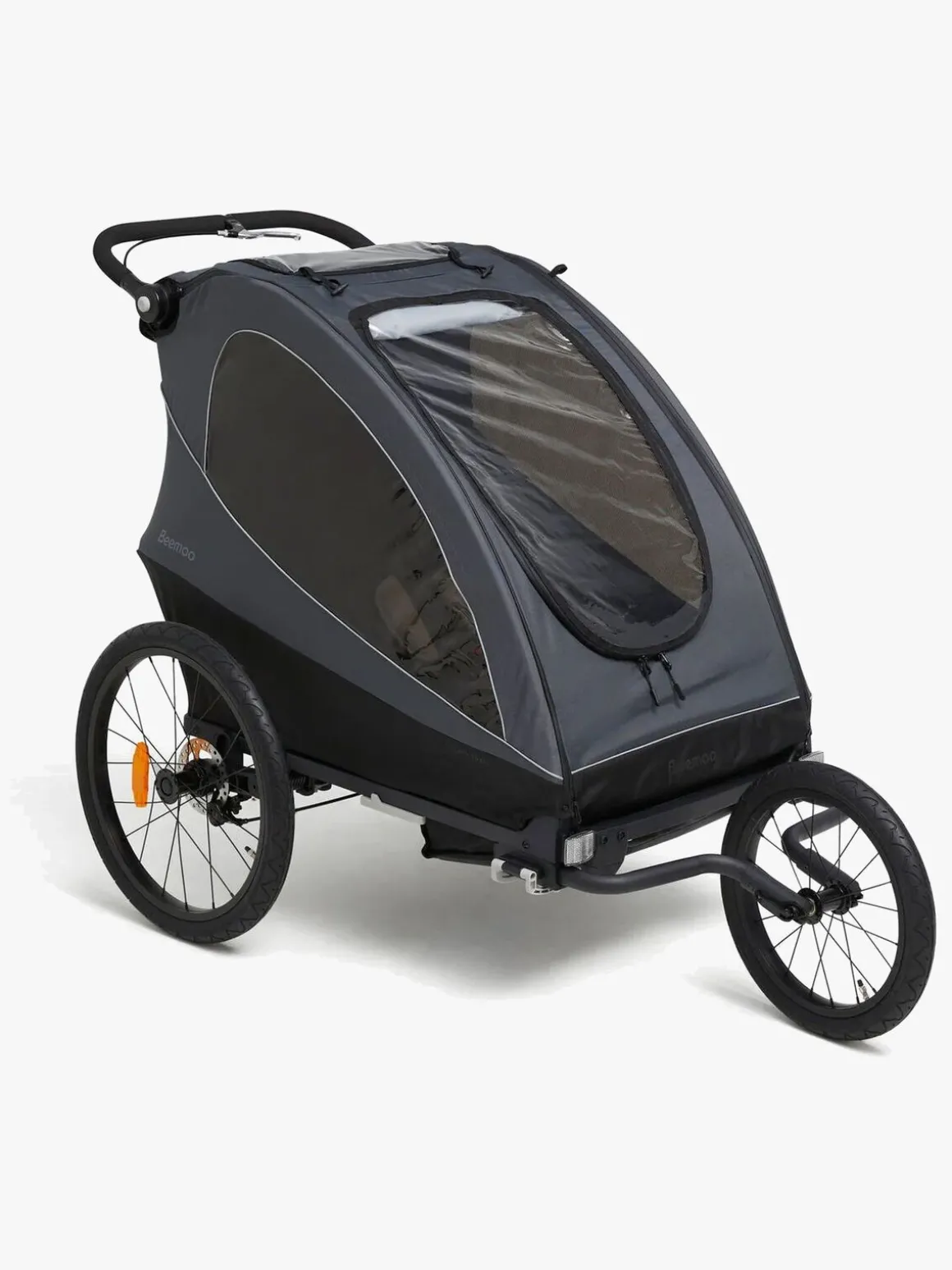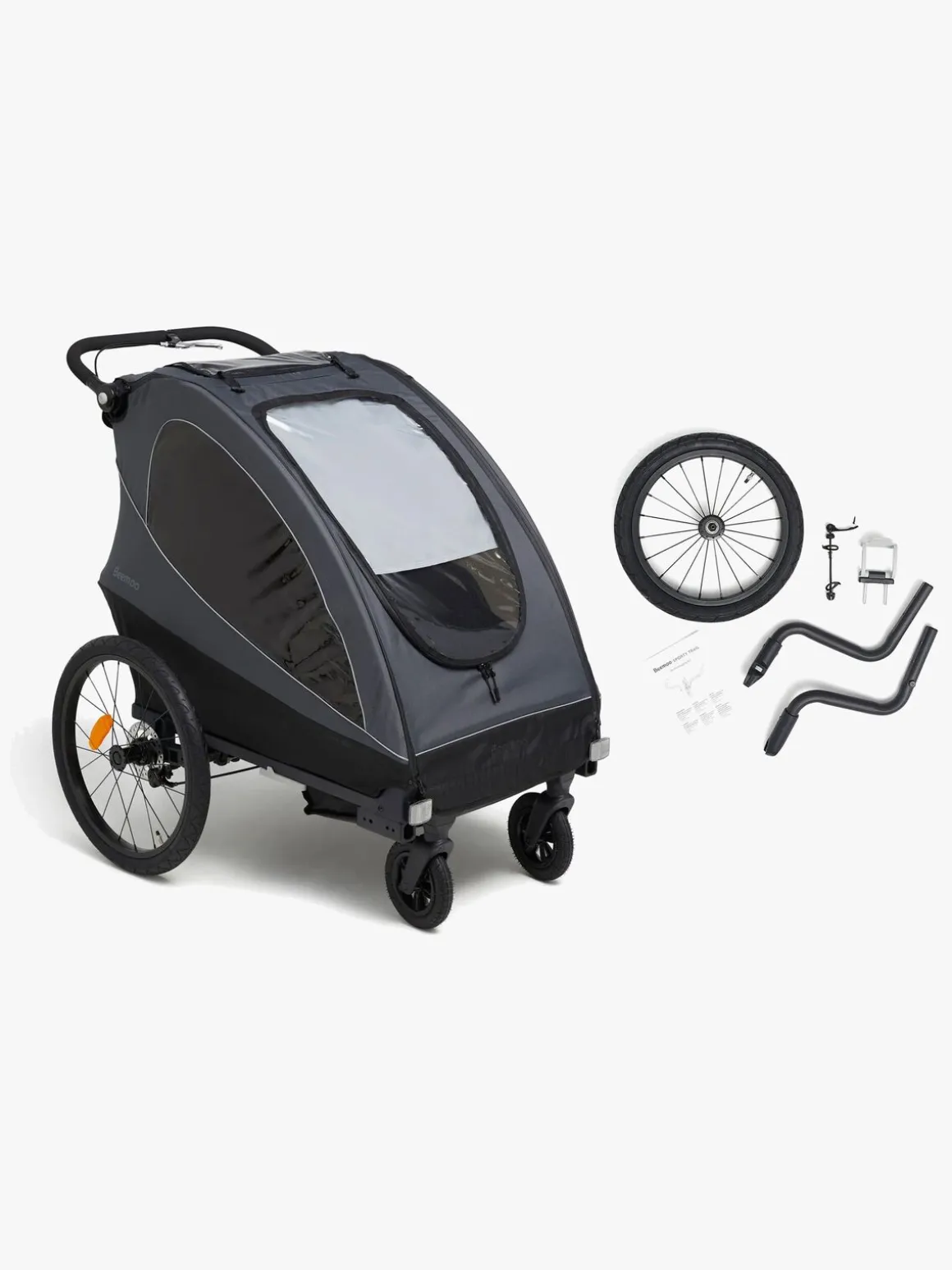 Sporty Trail løbesættet fra Beemoo medfølger i denne pakke. Skift til løbehjulet på din vogn, når du vil bruge vognen til at løbe med i stedet for at cykle. Løbesættet består af to hjularme, et løbehjul og en strop.