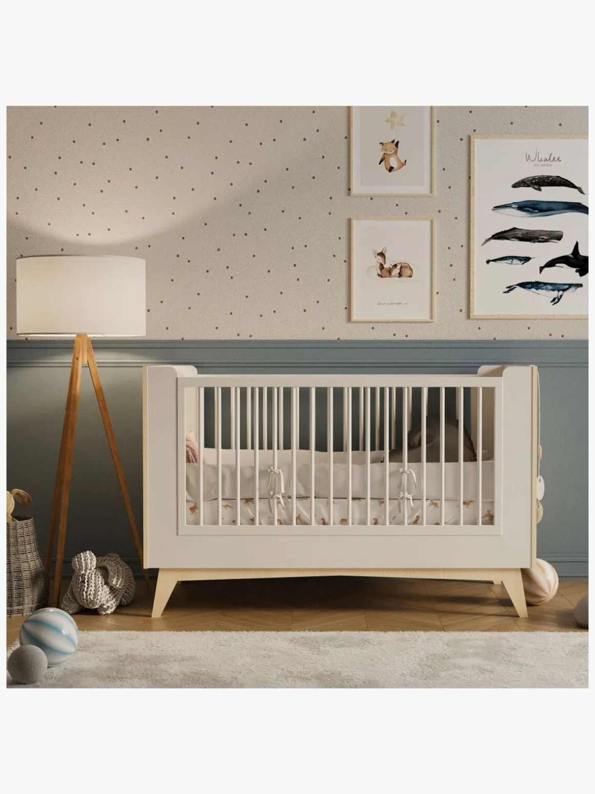 – Tremmeseng med tre niveauer til det voksende barn. Tre av tremmerne kan tages af, så barnet selv kan kravle ind og ud af sengen.