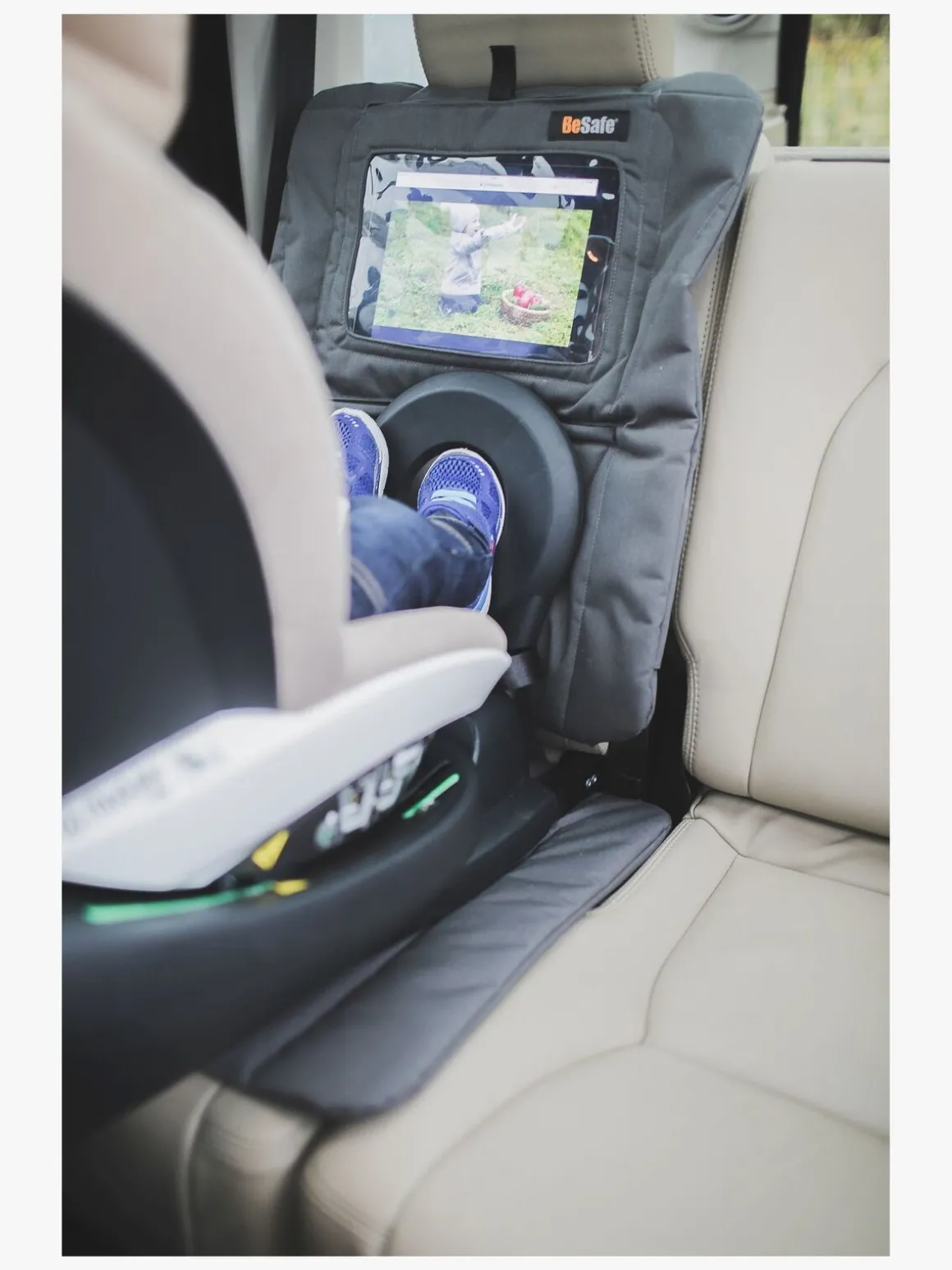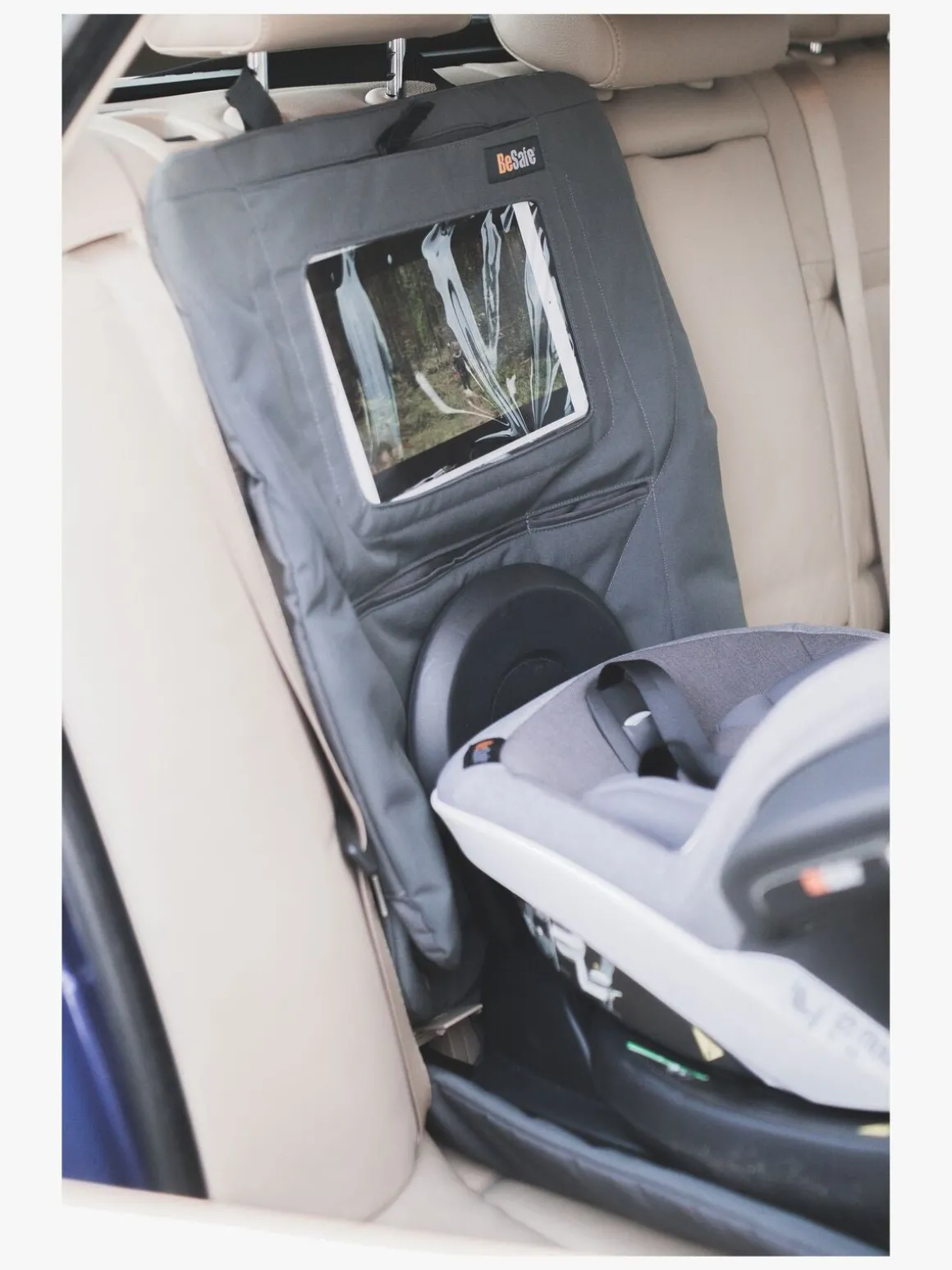 Sædebeskytteren har en smart gennemsigtig lomme til en tablet og små mindre lommer med velcrolukning, hvor der kan blive plads til opbevaring af alle småtingene. Praktisk og smart når hele familien skal på tur!