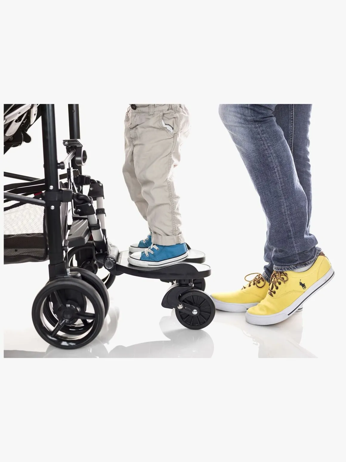 En afbalanceret affjedringsteknik giver barnet en jævn og behagelig ståplads, selv på ujævnt underlag, og det sættes fast på barnevognen med et snuptag. Lettere bliver det ikke!
