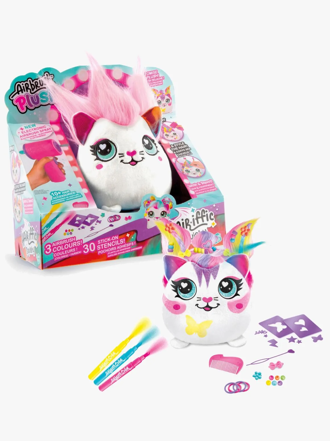 – Indeholder: 1 bamse, 1 airbrush-værktøj, 30 klistermærkeskabeloner, 3 airbrush-tusser, 10 hårtilbehør.