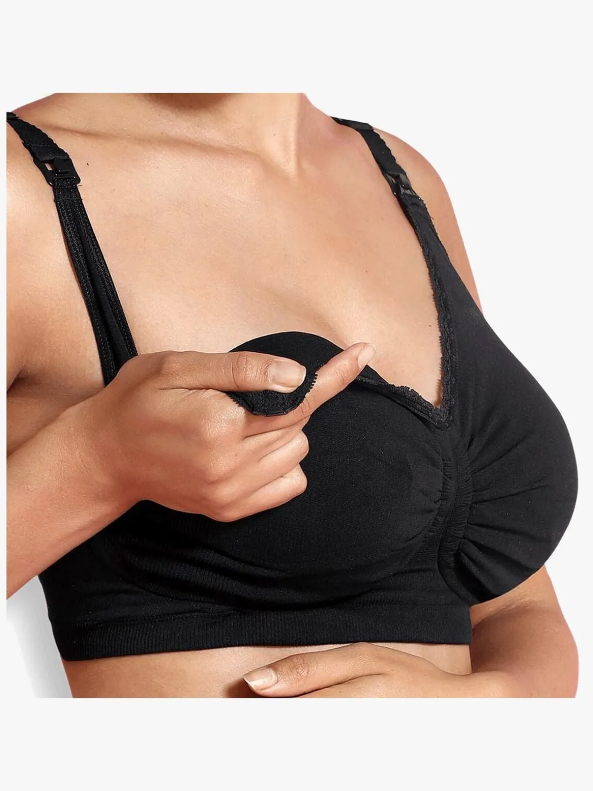 Når du skal amme, kan du åbne ammeåbningen med bare en hånd. For øget fleksibilitet medfølger der en bh-forlænger. Dens dybe nedringning sikrer at bh’en sidder diskret under nedringede trøjer.