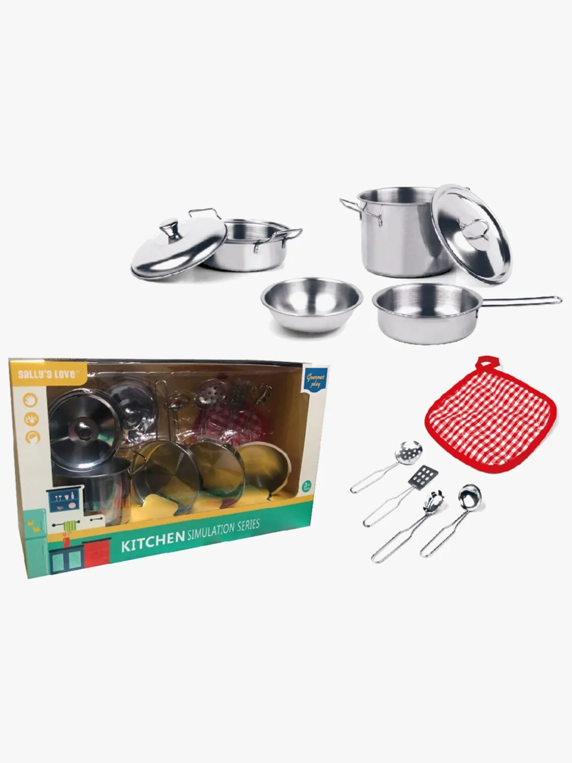 – Indeholder: 2 gryder med låg, 1 kasserolle, 1 skål, 4 redskaber, 1 grydelap.