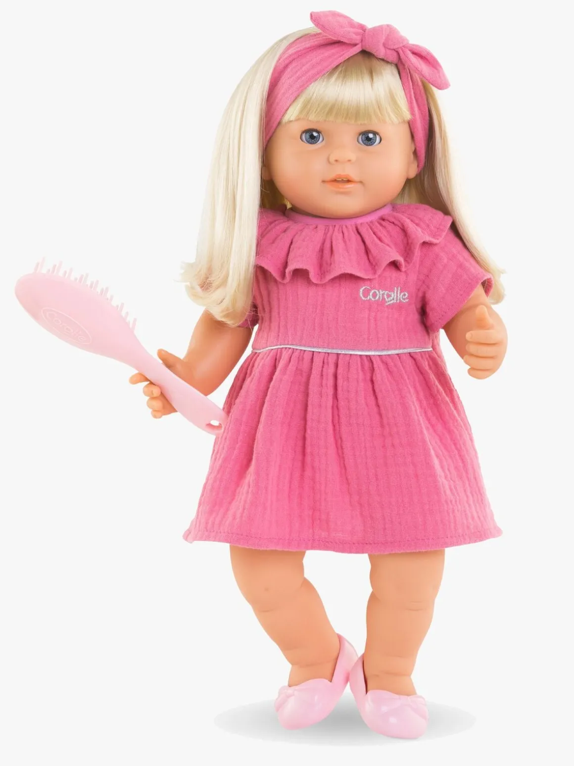 – Dukken er klædt i en lyserød kjole, med pandebånd og matchende ballerinasko.