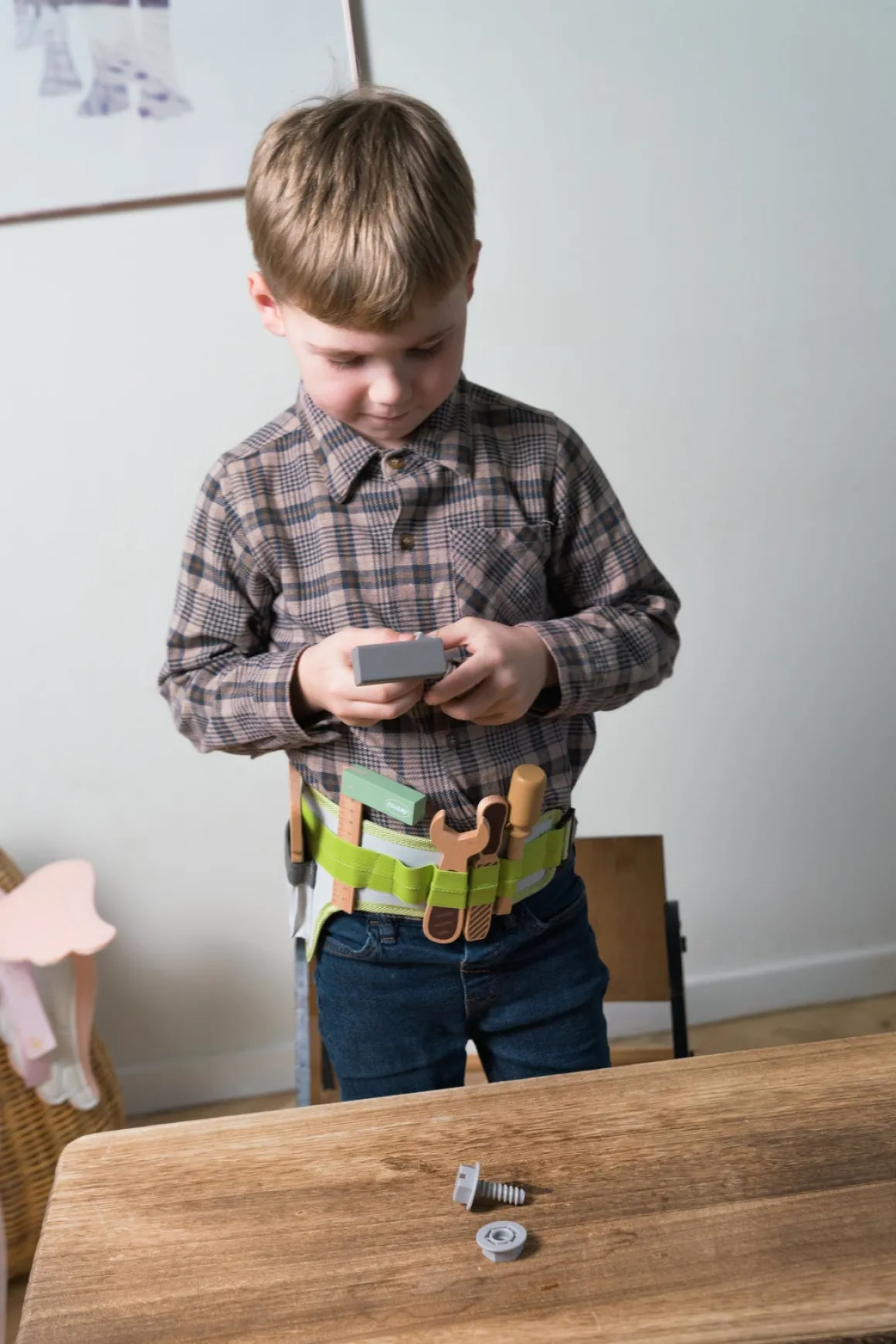 – Indeholder: 1 værktøjsbælte, 1 skruetrækker, 1 skruenøgle, 1 hammer, 1 fil, 1 vinkelmåler, 1 sav.
