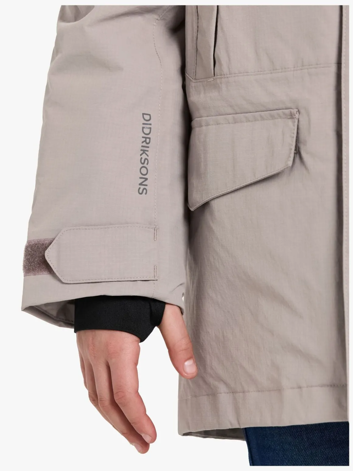 – Elastiske ærmeender med hul til tommelfinger.