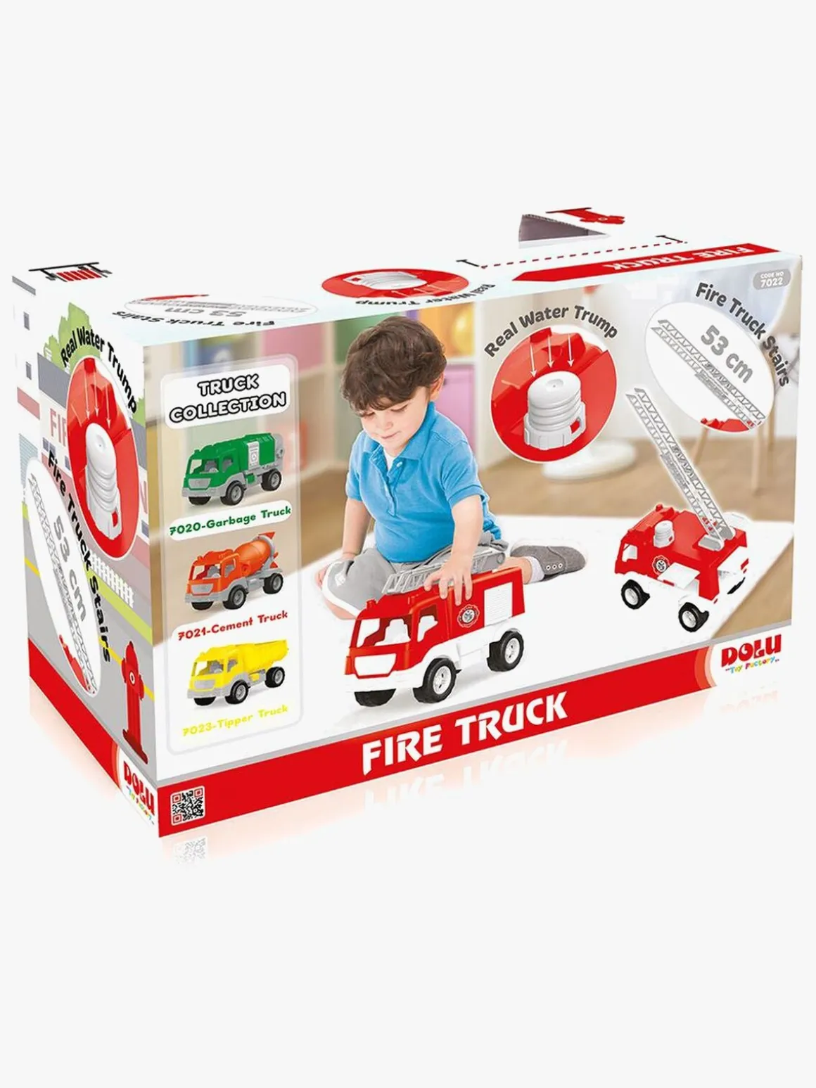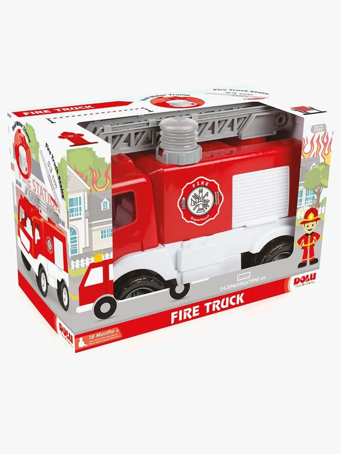 Brandbilen har en rigtig vandpumpe og tre låger, der kan åbnes.
