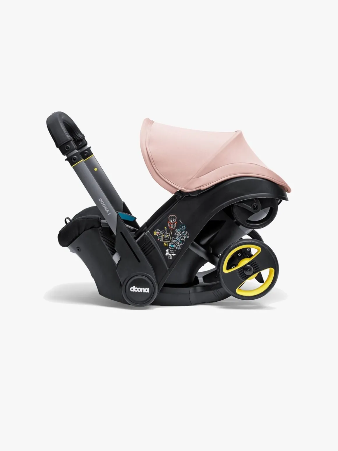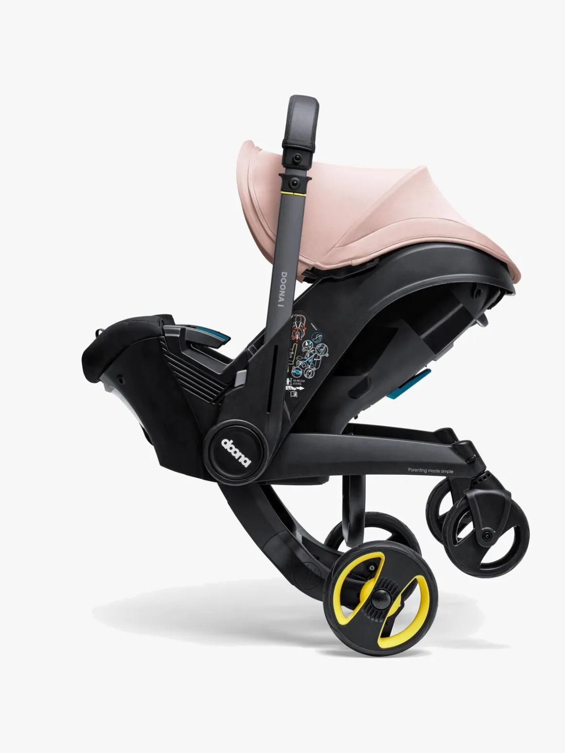 – Med et tryk på en knap foldes hjulene ud, og babyautostolen forvandles til en barnevogn!