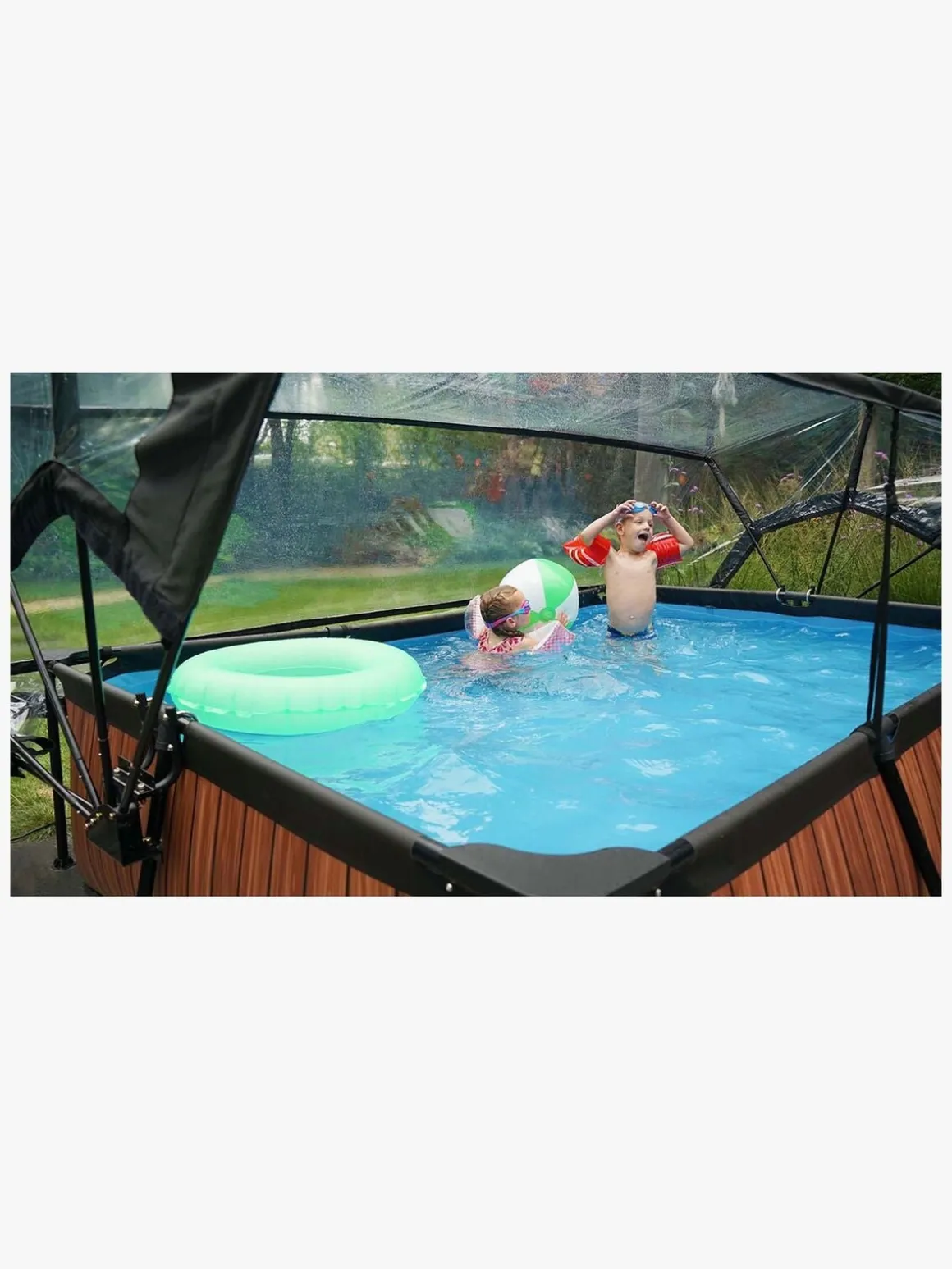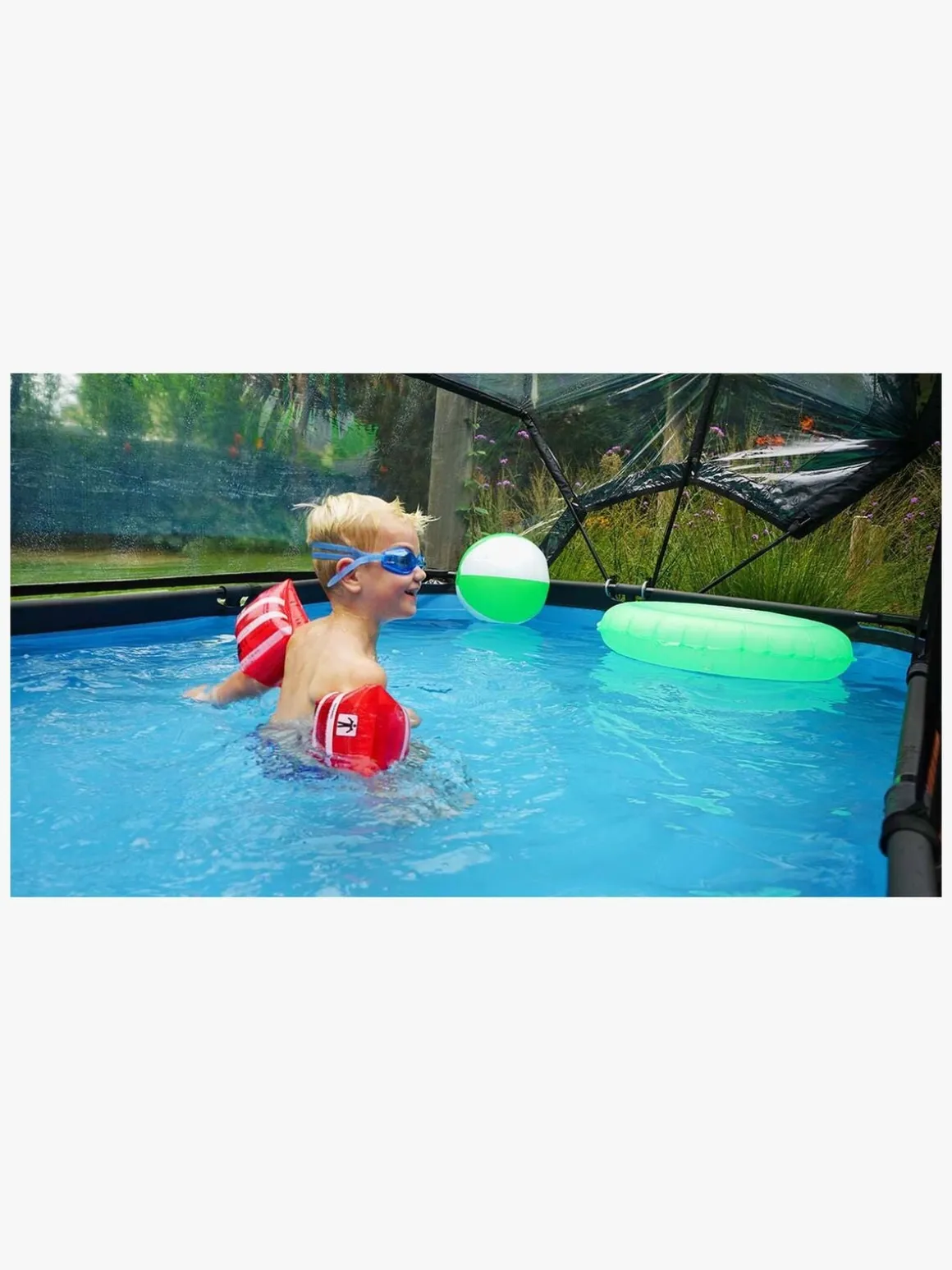 | Øvrige mål | Passer til pools der måler: 290 x 190 och 300 x 200 cm Passer til højere pools med ramme: 50-130 cm Øverste skinnes diameter: Ø50 mm Benenes maksimale diameter: Ø40 mm |