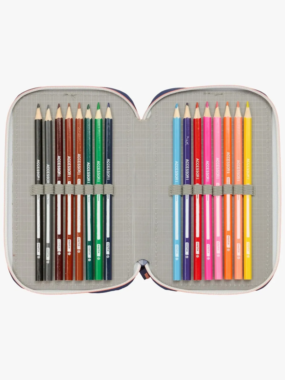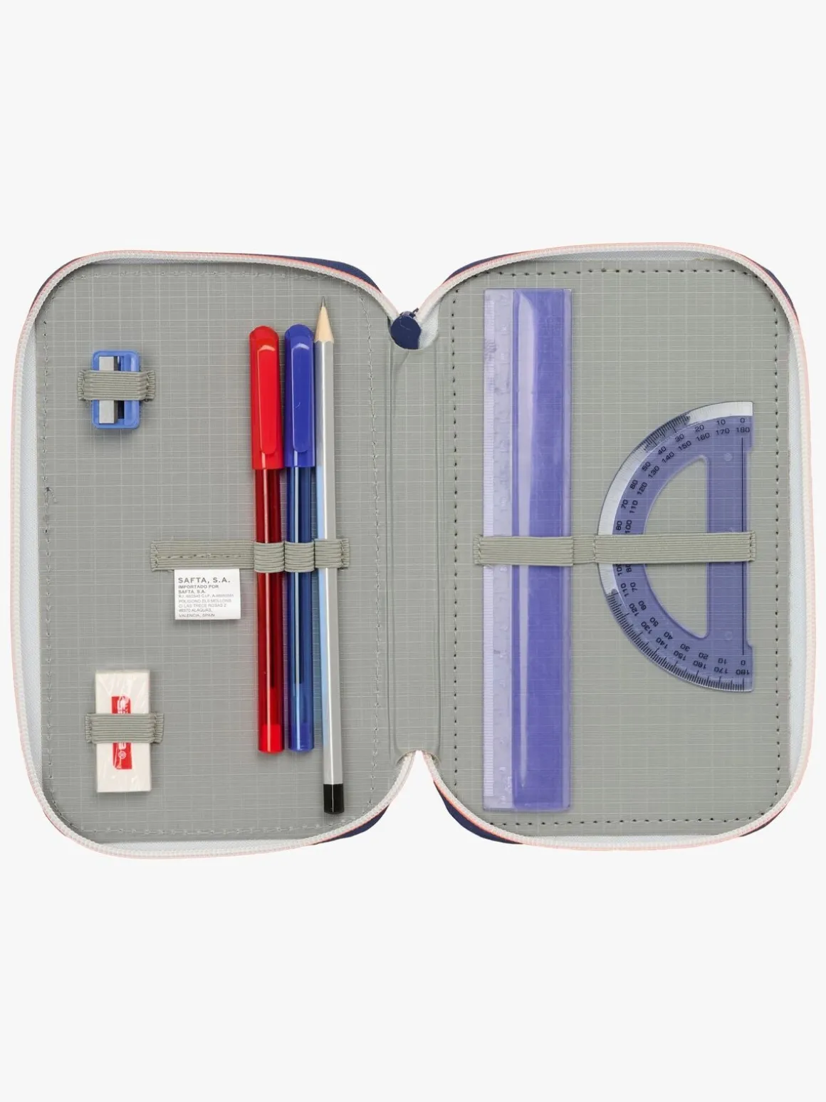 – Indeholder: 1 penalhus, 1 viskelæder, 1 blyant, 2 kuglepenne, 1 blyantspidser, 2 linealer, 16 farveblyanter, 14 tusser.