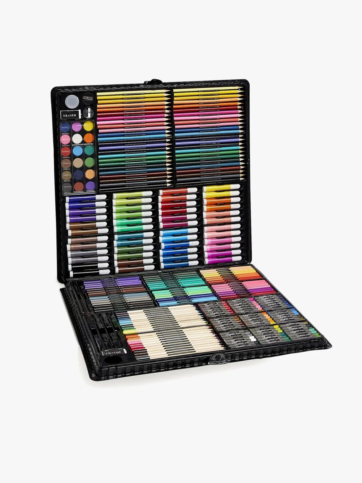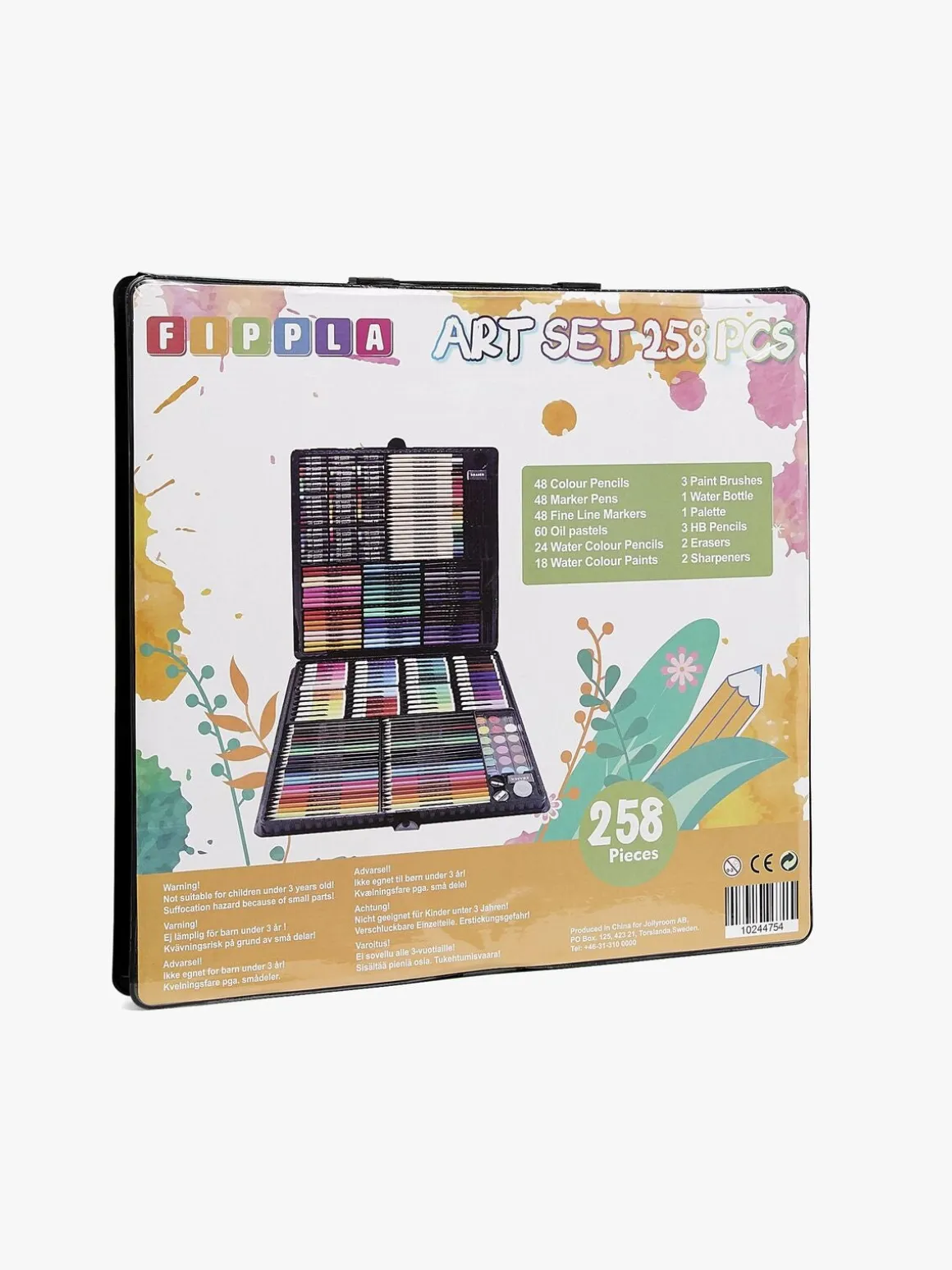 – Indeholder: 48 farveblyanter, 48 fibertusser, 48 spidse tusser, 60 oliepastelfarver, 24 vandfarveblyanter, 18 vandfarver, 3 pensler, 1 palet, 3 blyanter, 2 viskelædere, 2 blyantspidsere.