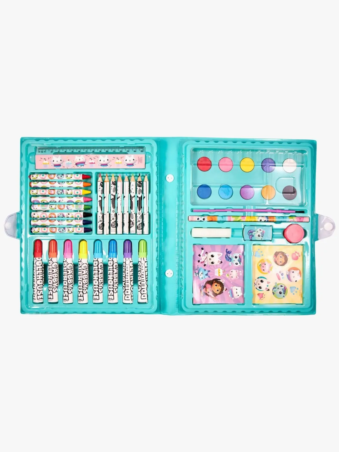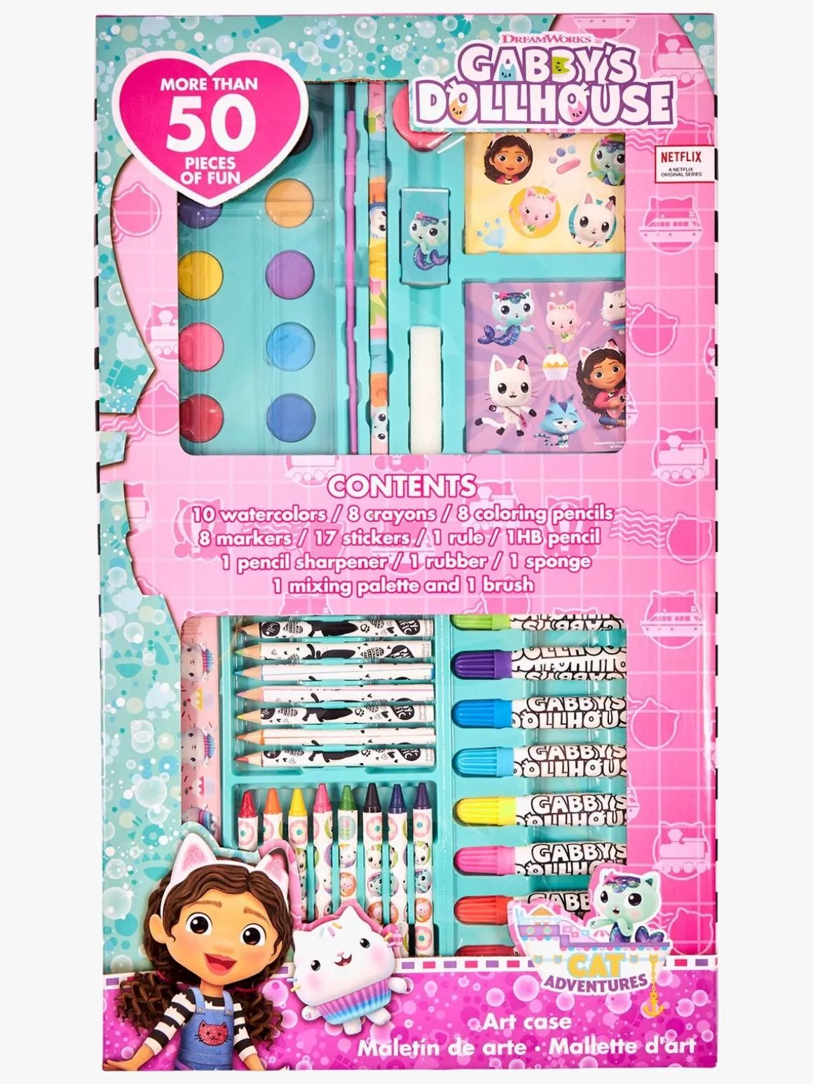 – Indeholder: 10 vandfarver, 8 farvekridt, 8 farveblyanter, 8 tusser, 17 klistermærker, 1 lineal, 1 blyant, 1 viskelæder, 1 svamp, 1 pensel, 1 palet.
