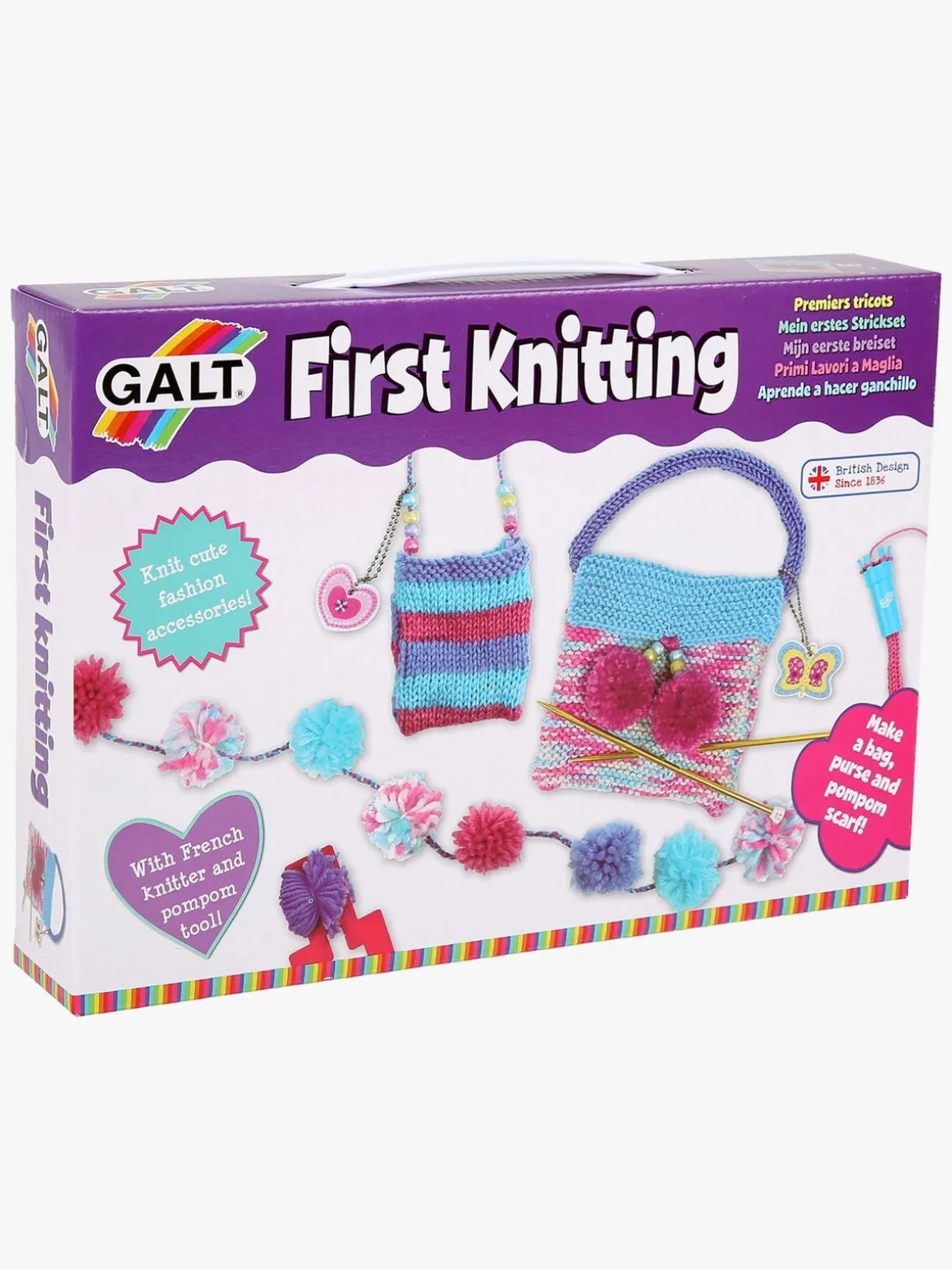 Indeholder blandt andet 8 garnnøgler, et sæt strikkepinde, en strikkelise og et pompon-værktøj.