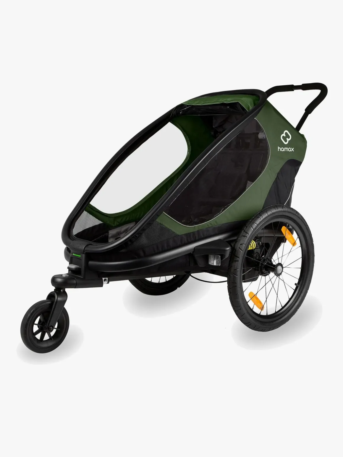 Double-locking-system gør det let og hurtigt at forvandle anhængeren til gåvogn og tilbage igen. Tydelige farveindikatorer viser grøn, når den er rigtigt monteret. Det gribevenlige skumhåndtag kan justeres frit i højden. Forhjulet kan afmonteres ved hjælp af trykknap. Vognen er udstyret med net, der beskytter mod sol, vind og insekter og hjælper med at give god ventilation.