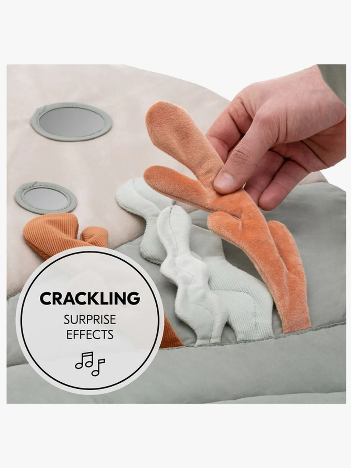 – Sjove farver og et spejl til visuel stimulering.