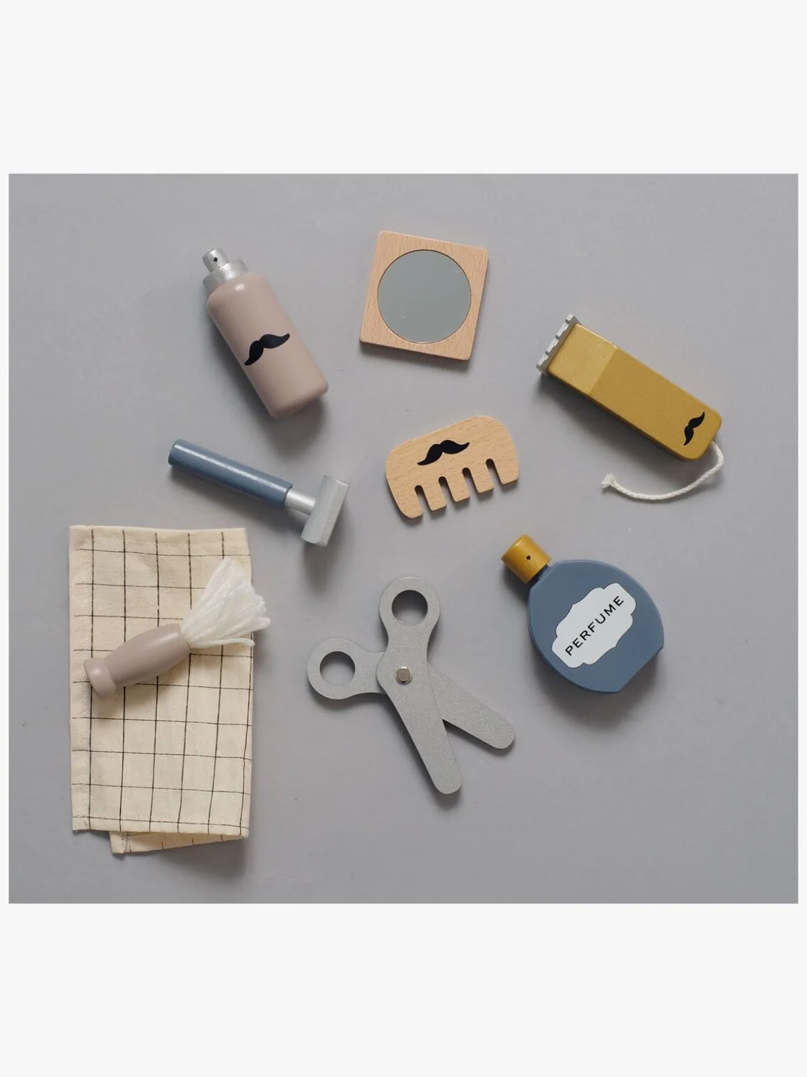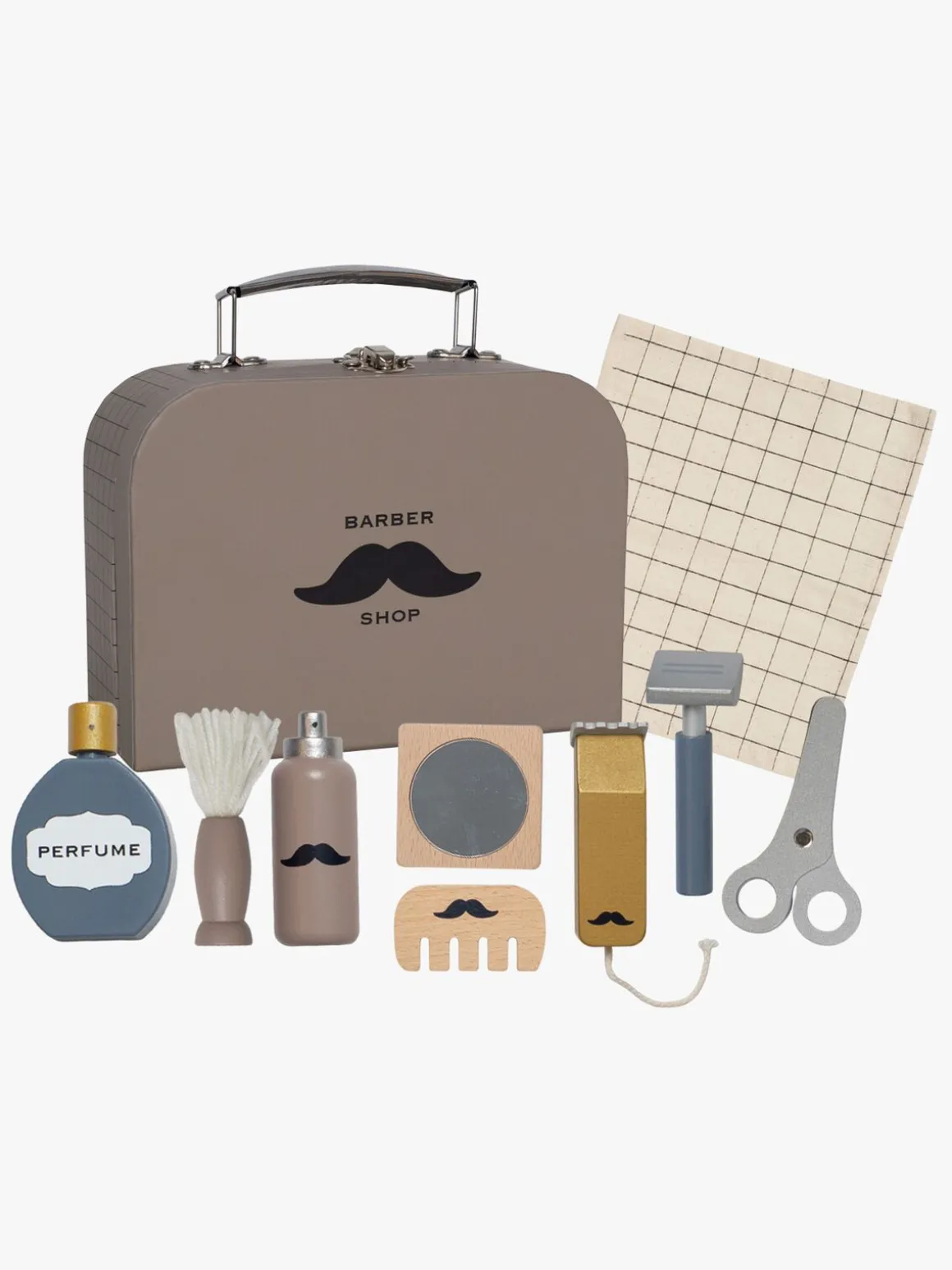 – Indeholder en barbermaskine, skægtrimmer, barberskum med børste og klud, en saks, kam, en parfumeflaske og et lille spejl.