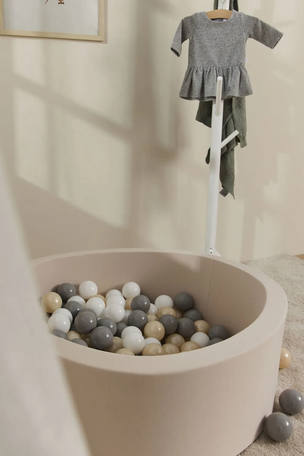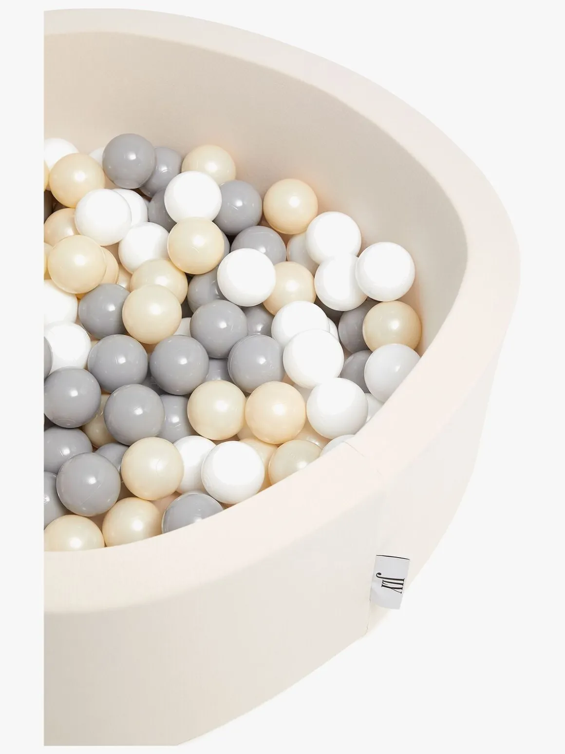 Dette skønne boldbassin er beklædt i blød, Oeko-Tex-certificeret bomuld og er fyldt med 150 bolde, der er fremstillet af giftfri PE-plast. Boldene kommer i farverne hvid, grå og metallisk beige. Betrækket kan tages af og vaskes i maskinen, så du let kan fjerne pletter, hvis uheldet skulle være ude.