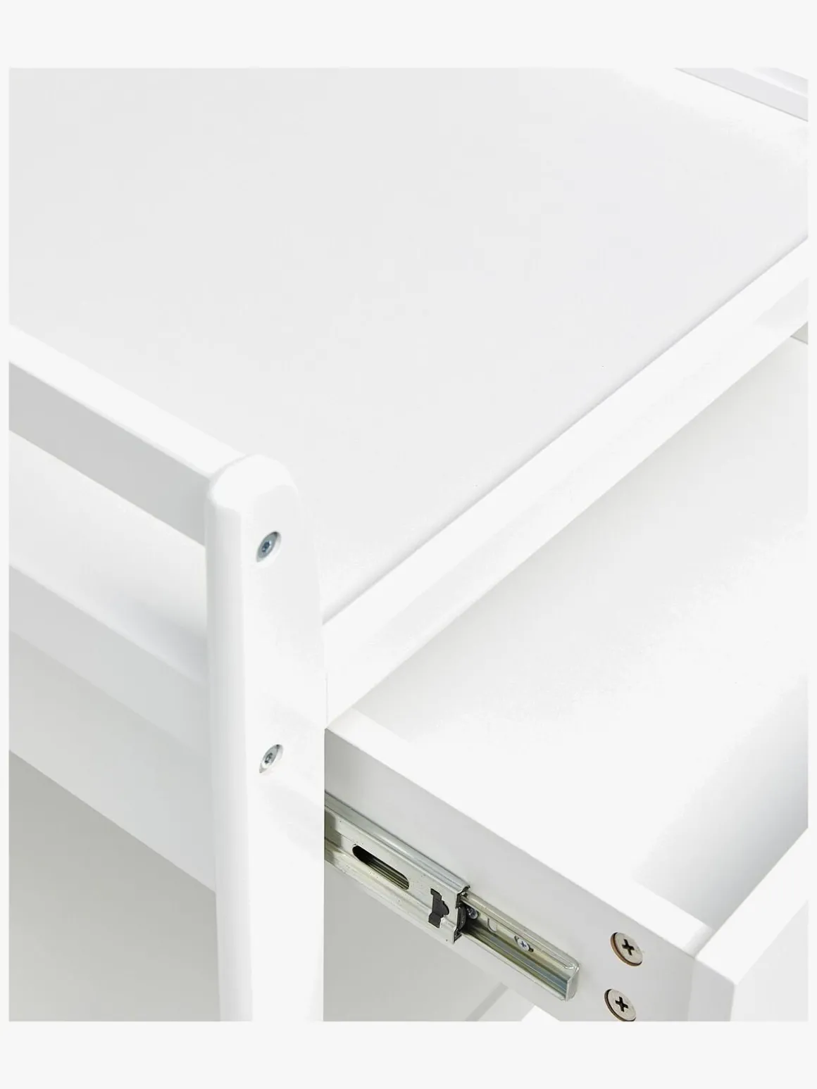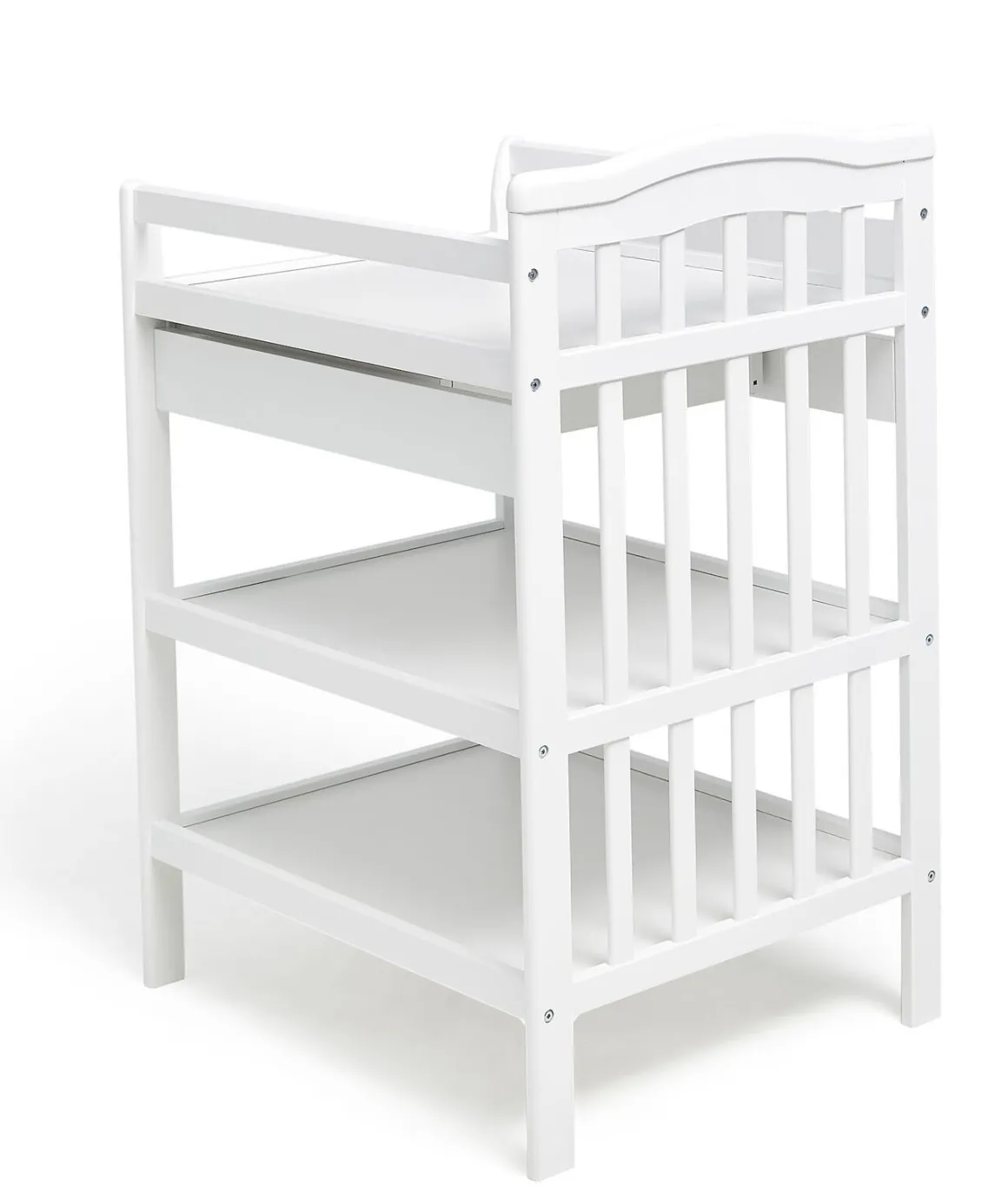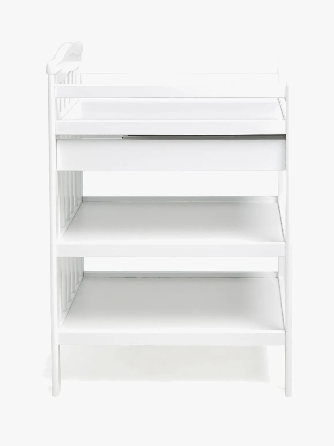 | Øvrige mål | Mål til puslepude: 52 x 66 cm Højde mellem hylderne: 22 cm Højde fra gulv til øverste hylde: 80 cm Sider (hvor barnet ligger): 12,5 cm Gavl hovedende: 21 cm Benenes mål: 5 x 1,8 cm Skuffens mål (indersiden): 43 x 46,5 x 6,5 cm |