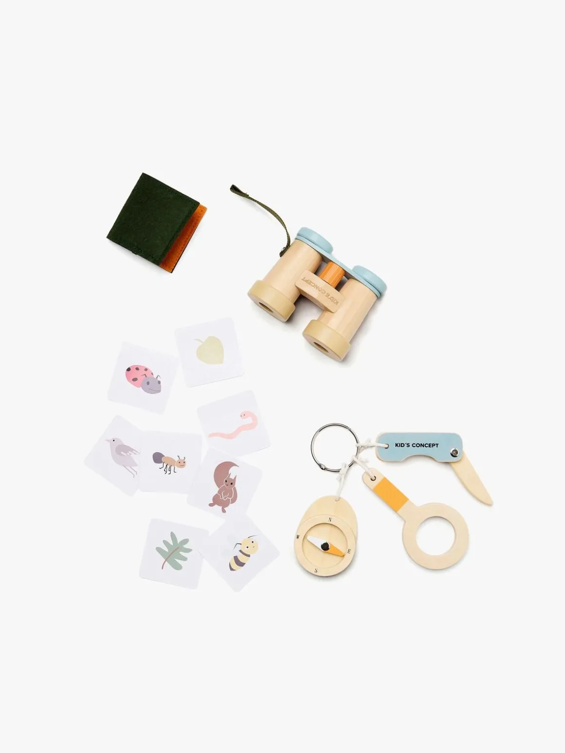 – Indeholder: 1 kortholder, 1 forstørrelsesglas, 1 kikkert, 1 kompas, 1 legetøjskniv, 8 laminerede kort.