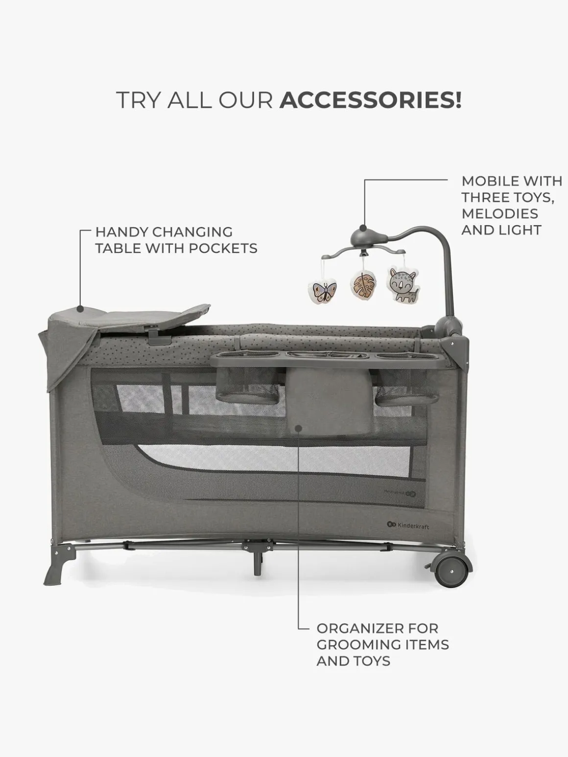 – Inkluderer: transporttaske, madras, sengeuro, puslebord, organizer.