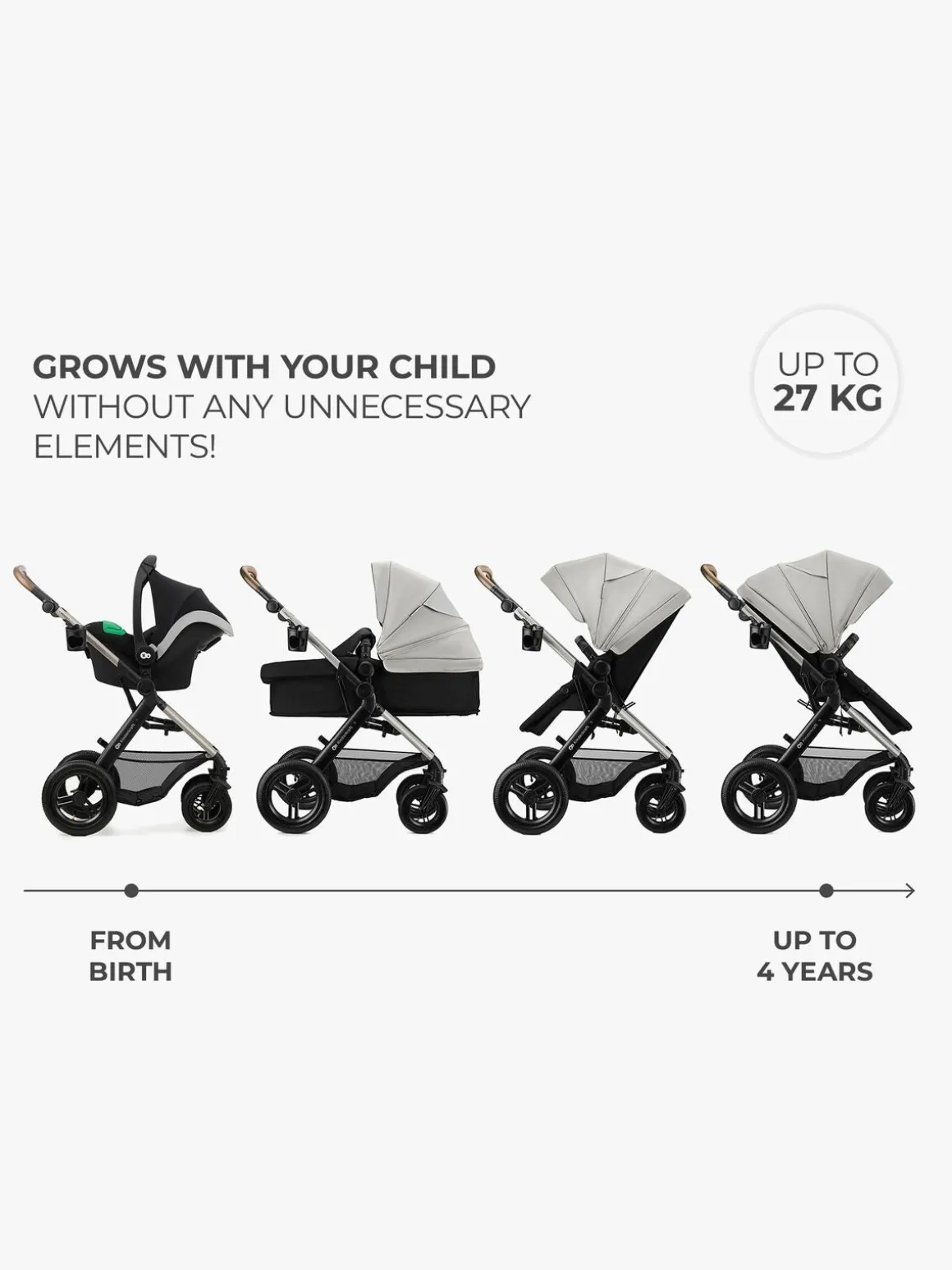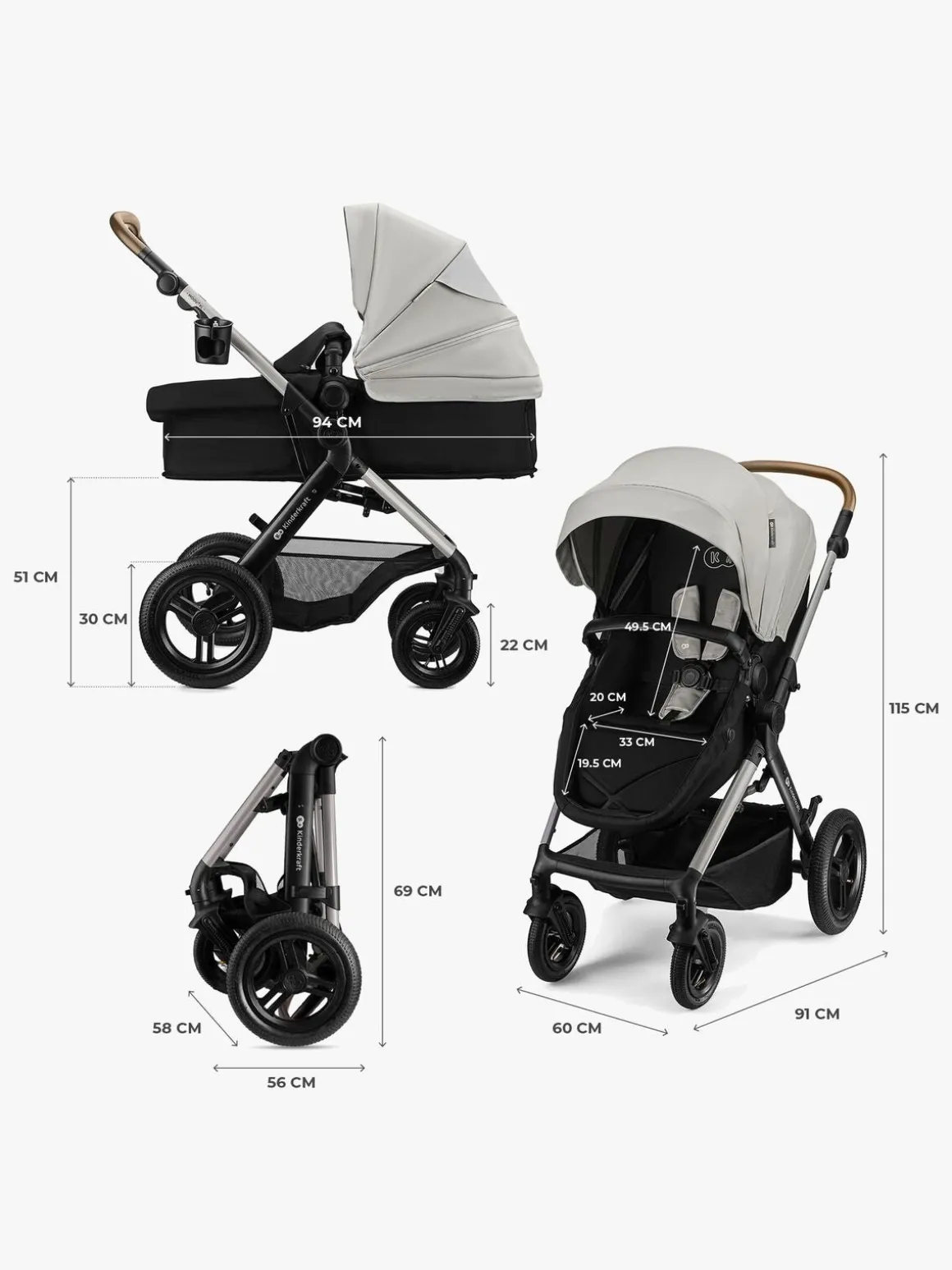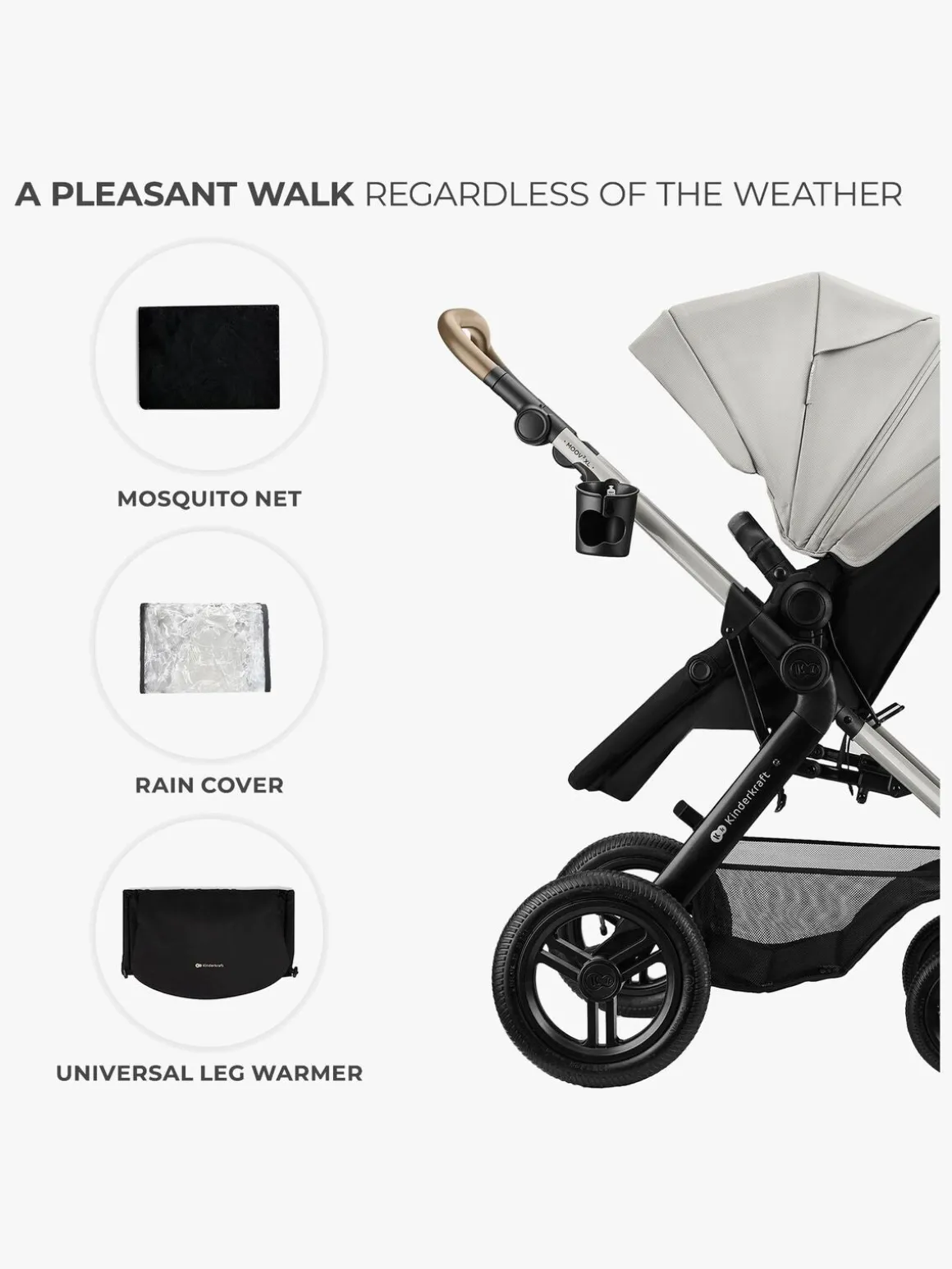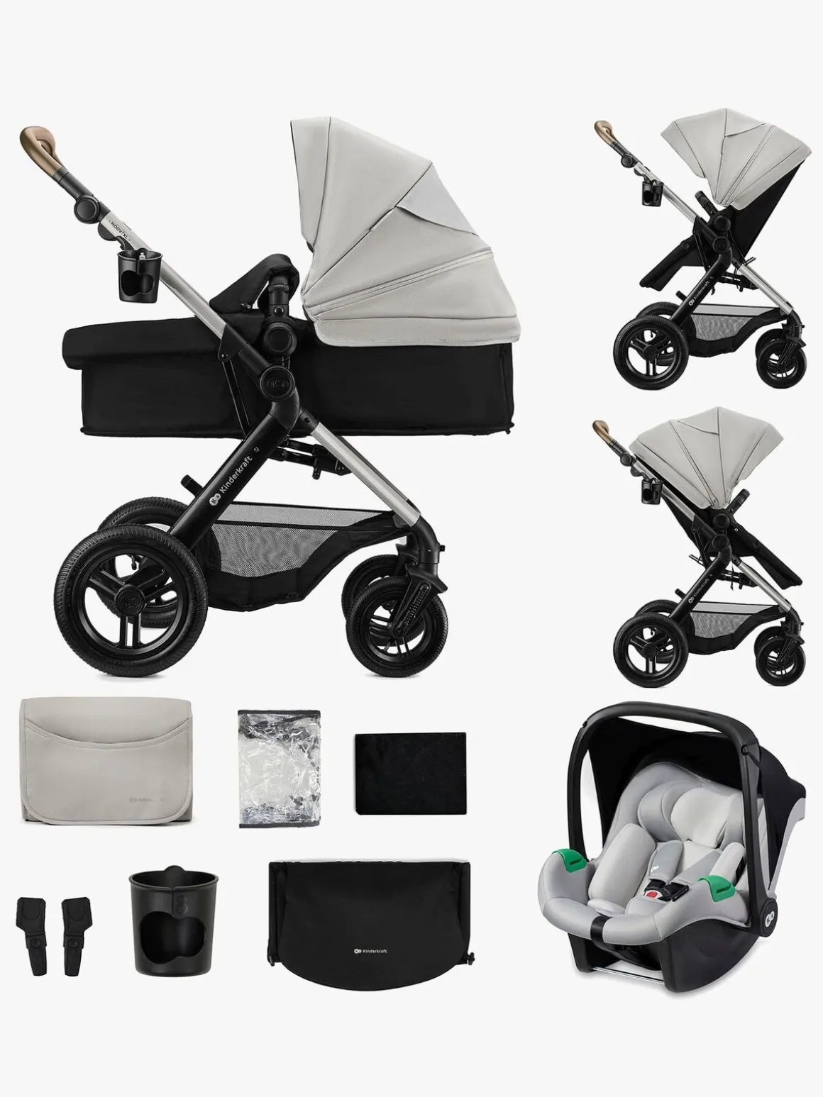 – Inkluderer: regnslag, myggenet, kørepose, pusletaske, adaptere, kopholder, babyautostol.