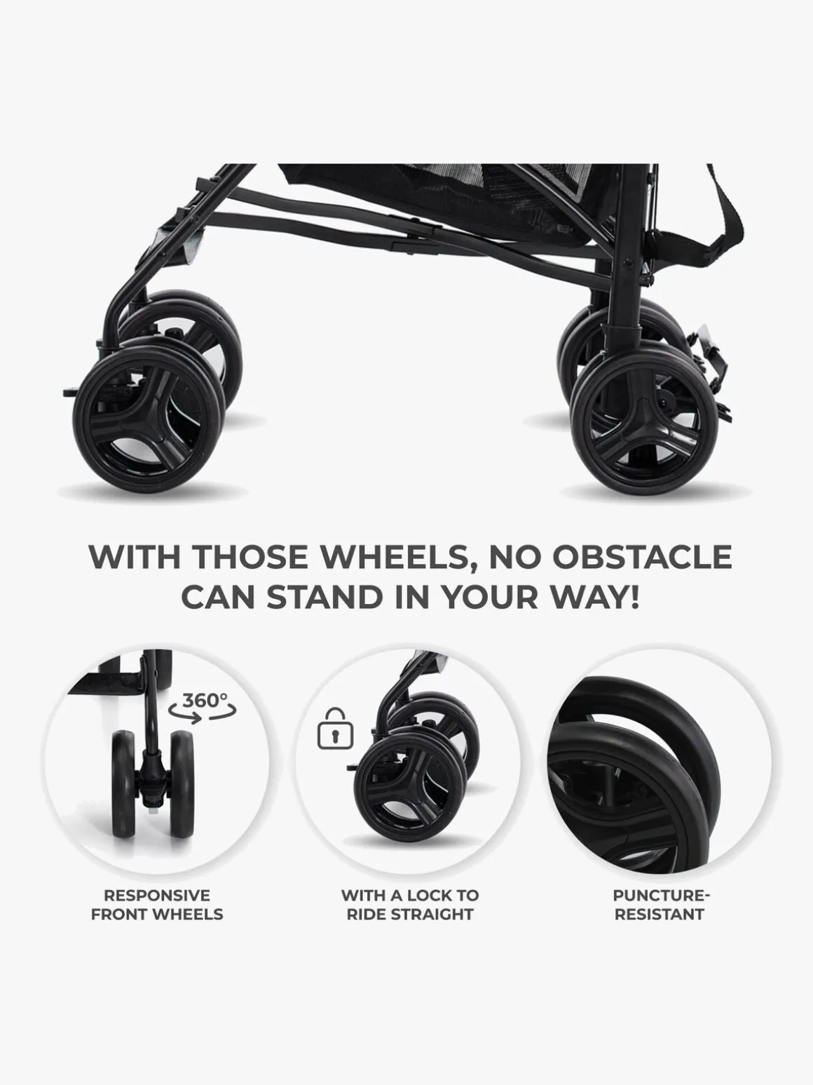 – Stødabsorberende for- og baghjul.