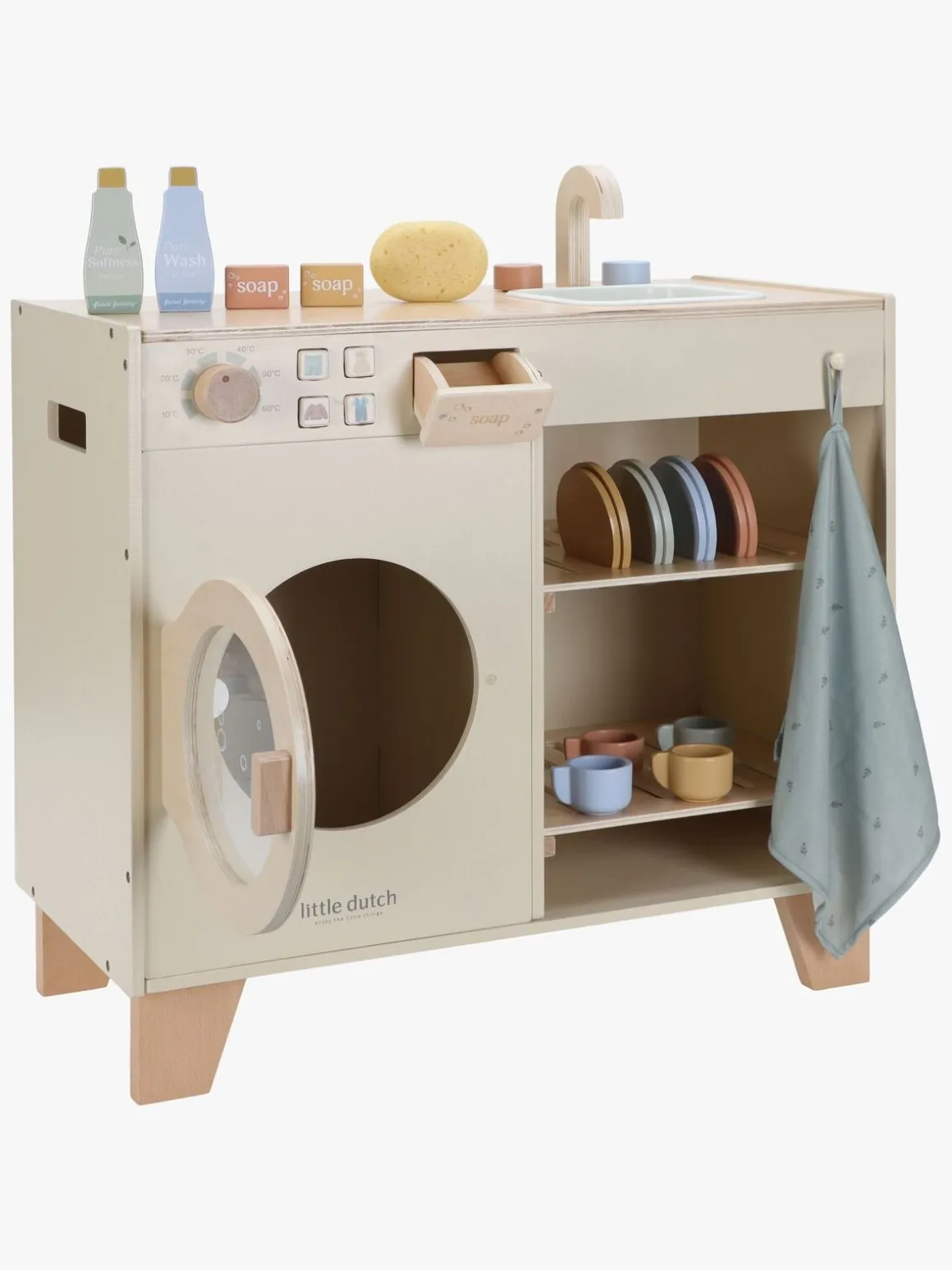 – Indeholder: 1 vaskemaskine, 4 tallerkener, 4 kopper, 1 håndklæde, 1 svamp, 4 sæber.