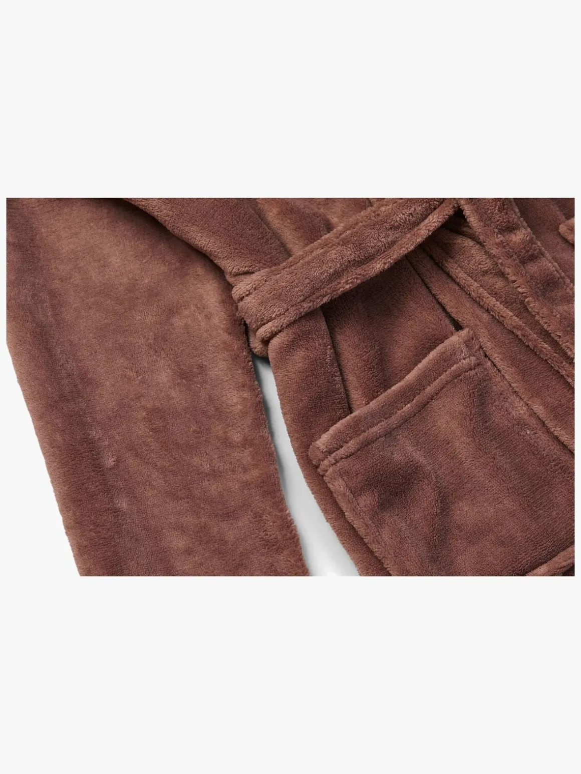 Badekåben har hætte, lommer og en snor omkring taljen.