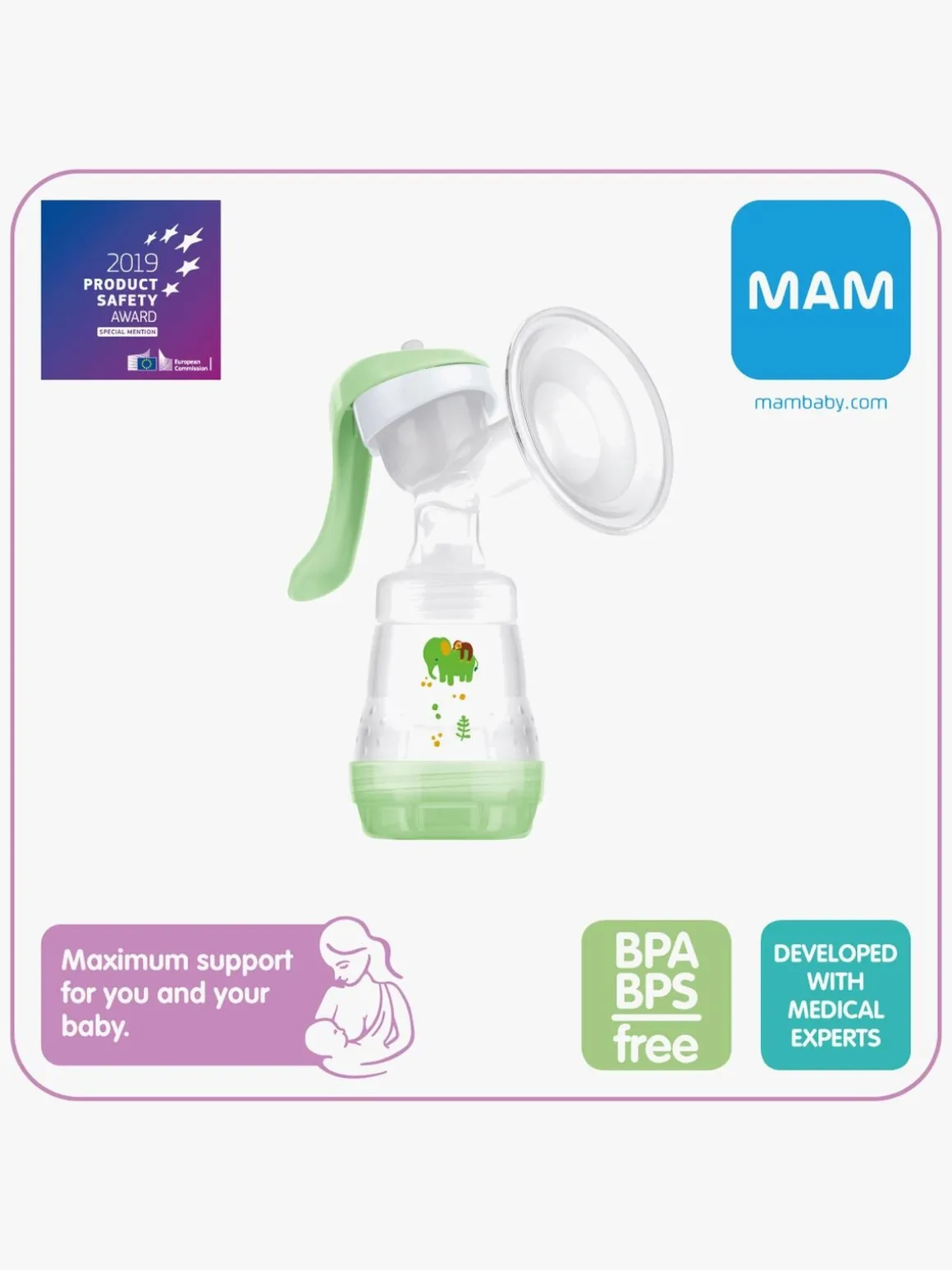 Pumpen passer til sutteflaskerne Easy Start og opbevaringsbeholderen fra MAM (skal købes separat). Du kan pumpe direkte i sutteflasken eller beholderen, så mælken kan opbevares i køleskabet eller fryseren.