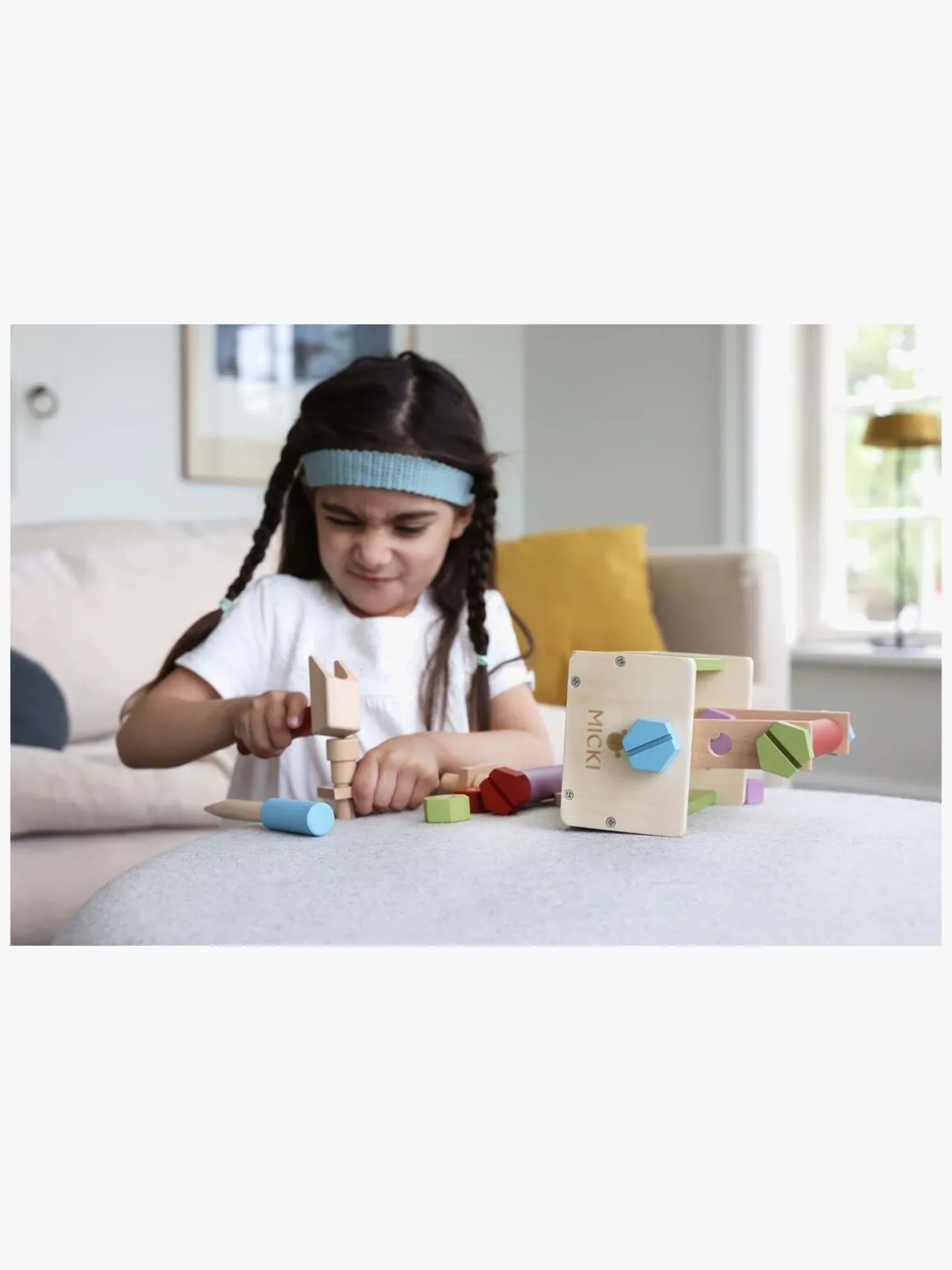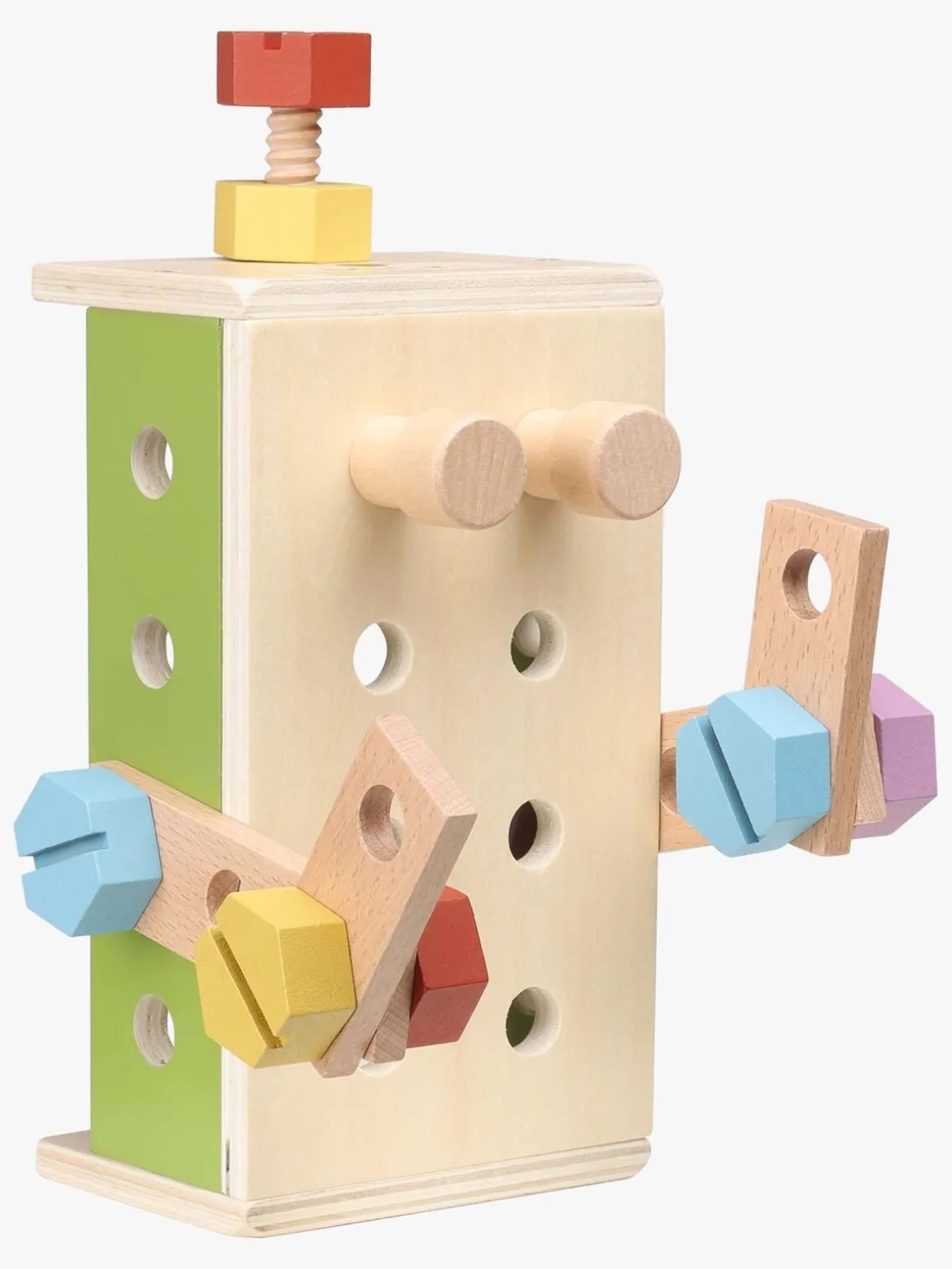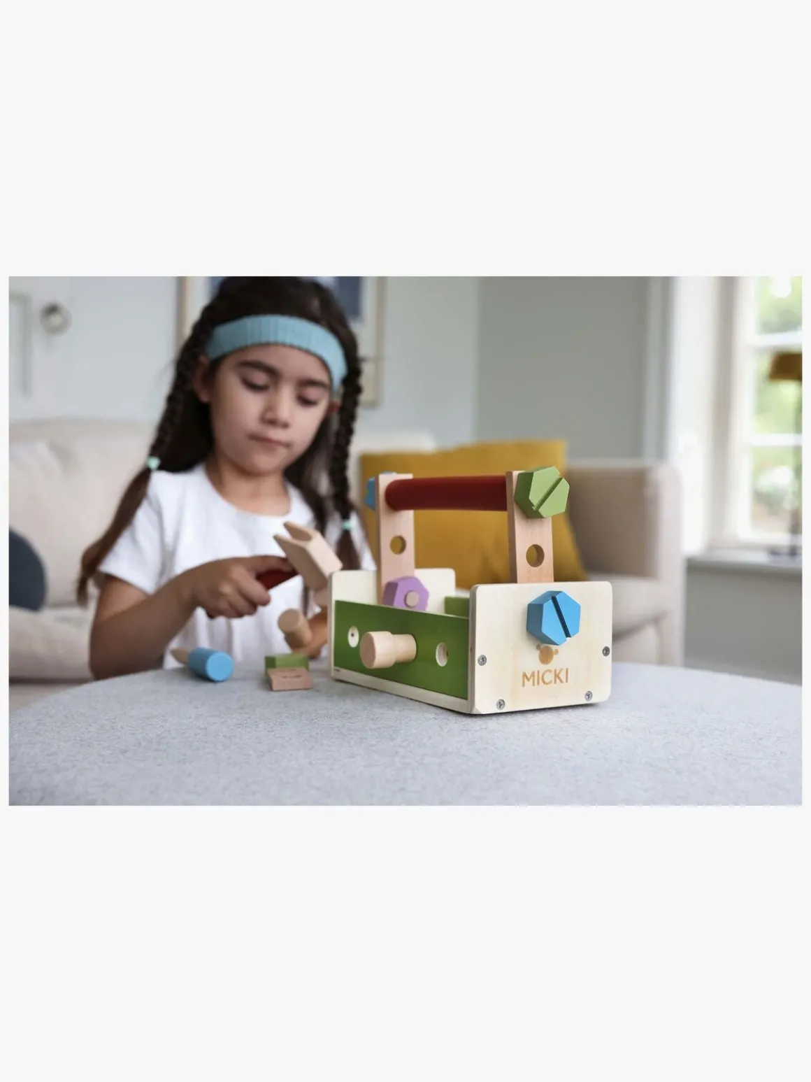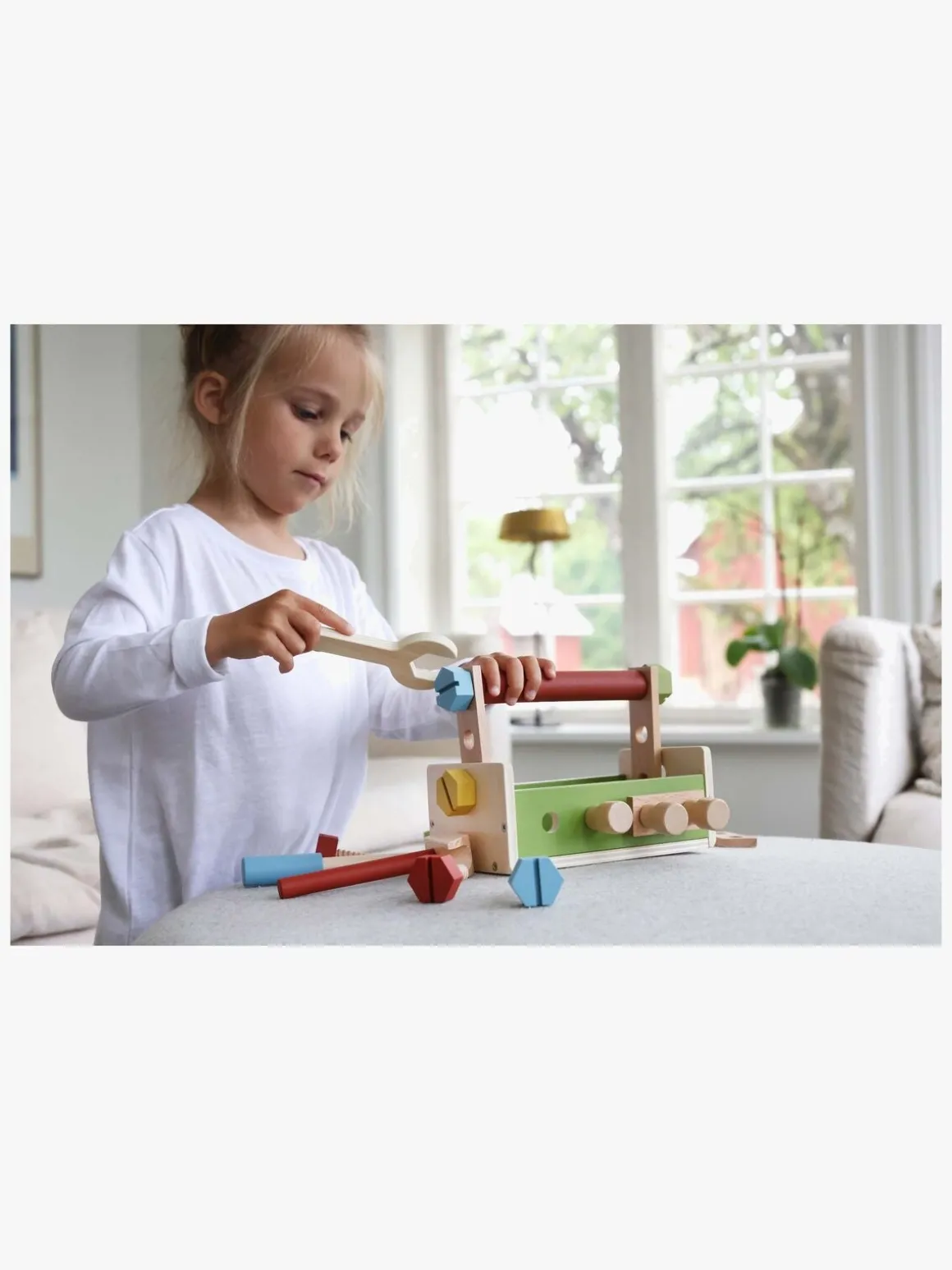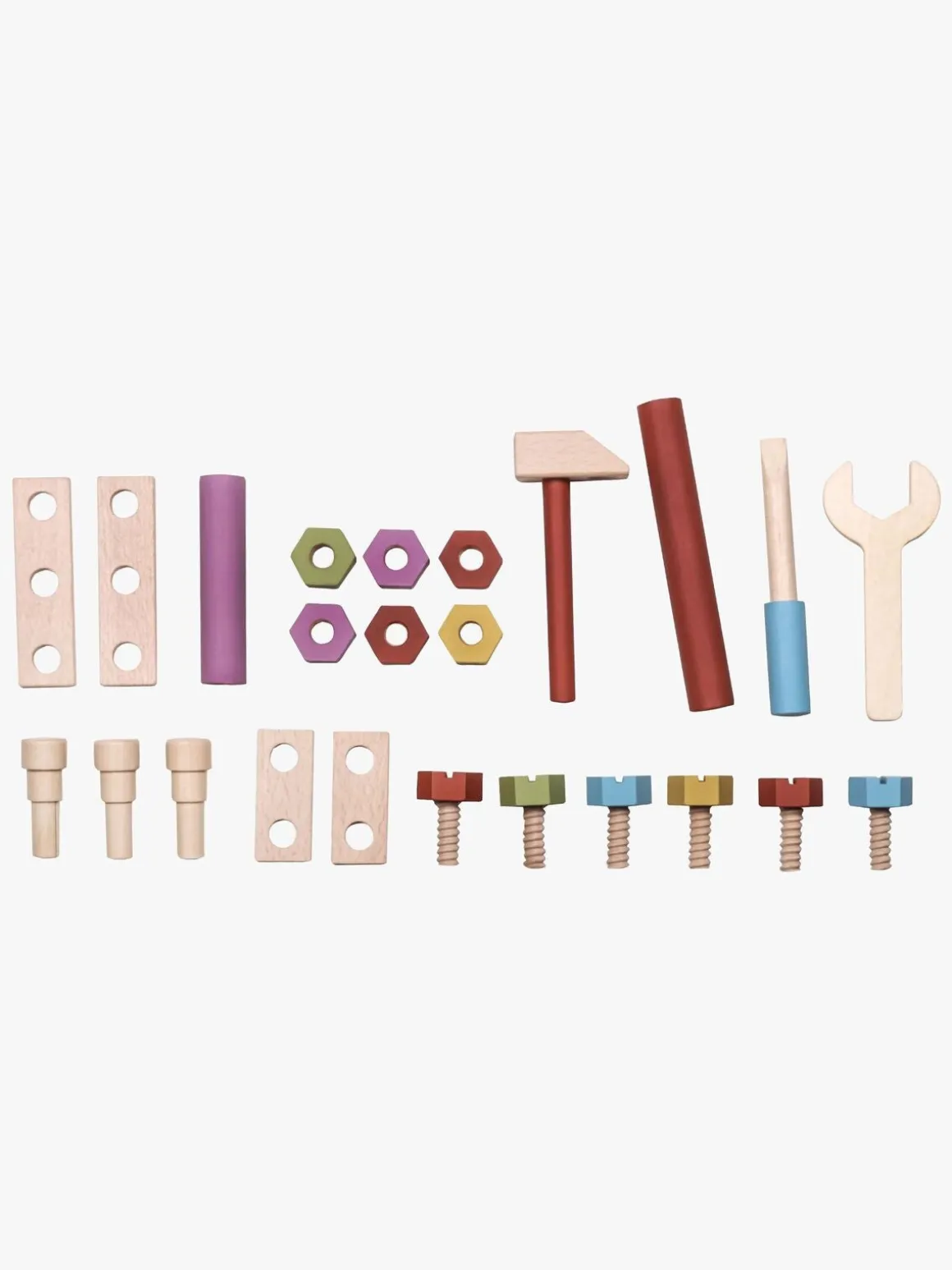 – Indeholder: 1 værktøjskasse, 1 hammer, 1 skruetrækker, 1 skruenøgle, 6 skruer, 6 møtrikker, 3 søm, 4 byggeplader, 2 rundstave.