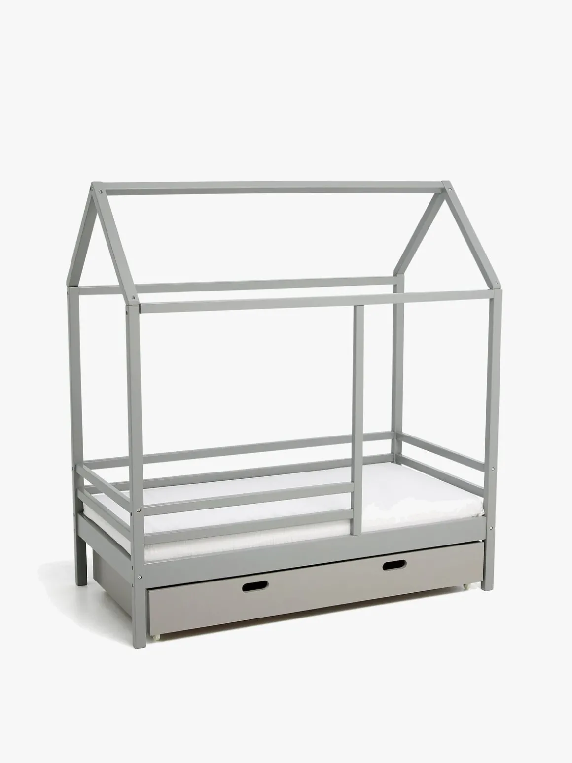Denne juniorseng har høje sider, bortset fra en lille åbning i fodenden, så dit barn kan sove og lege sikkert. Med i pakken medfølger en matchende sengeskuffe med god opbevaringsplads, der passer perfekt under sengen. Sengeskuffen fra Minitude har letrullende hjul på undersiden for let transport. Den har to håndtag og to store rum med plads til alle barnets yndlingsting.