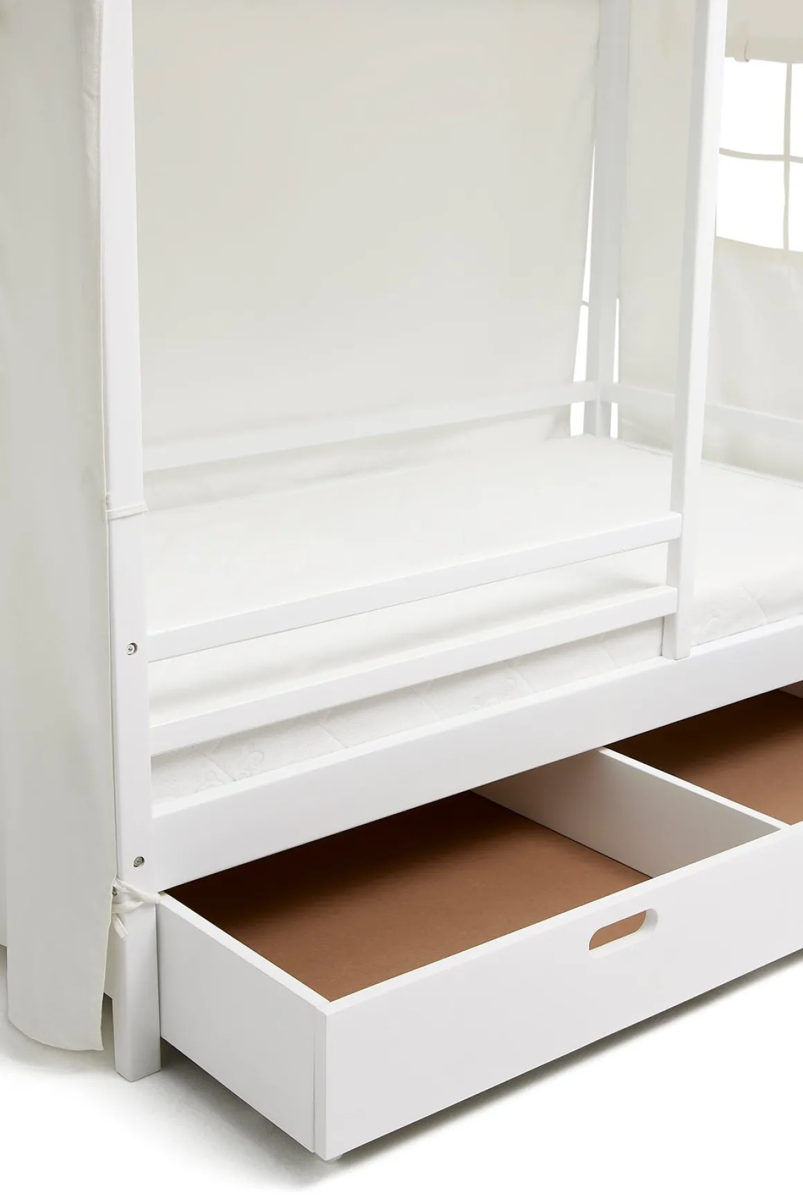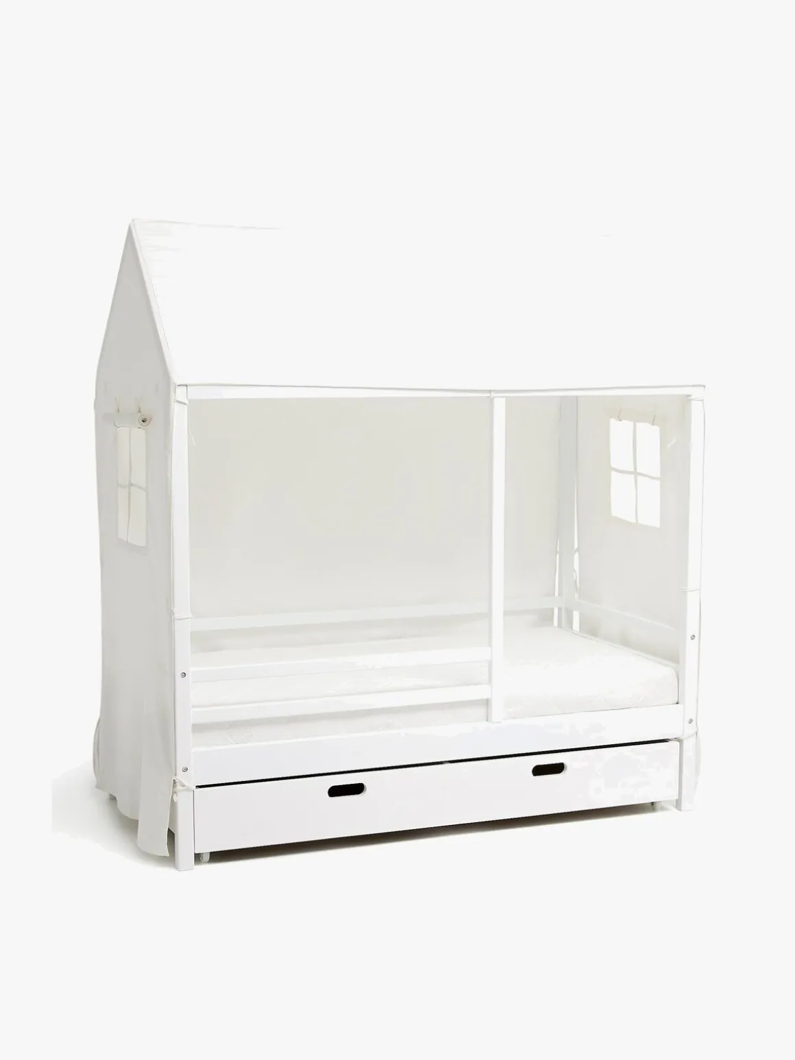 Den hyggelige sengehimmel fra Minitude har vinduer på de to kortsider. Siderne kan lukkes ved hjælp af velcro eller rulles op og bindes fast.