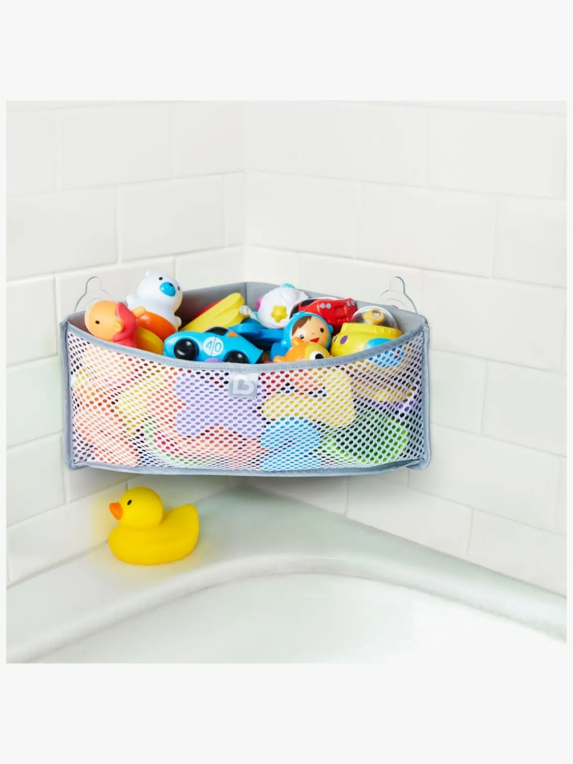Dette er High’n Dry Corner fra Munchkin, der giver en smart opbevaringsløsning til badelegetøj. En blød beholder, du sætter fast ved hjælp af sugekopper i hjørnet af badeværelset. Det ventilerende netmateriale lader luft slippe ind og lader legetøjet tørre efter brug.