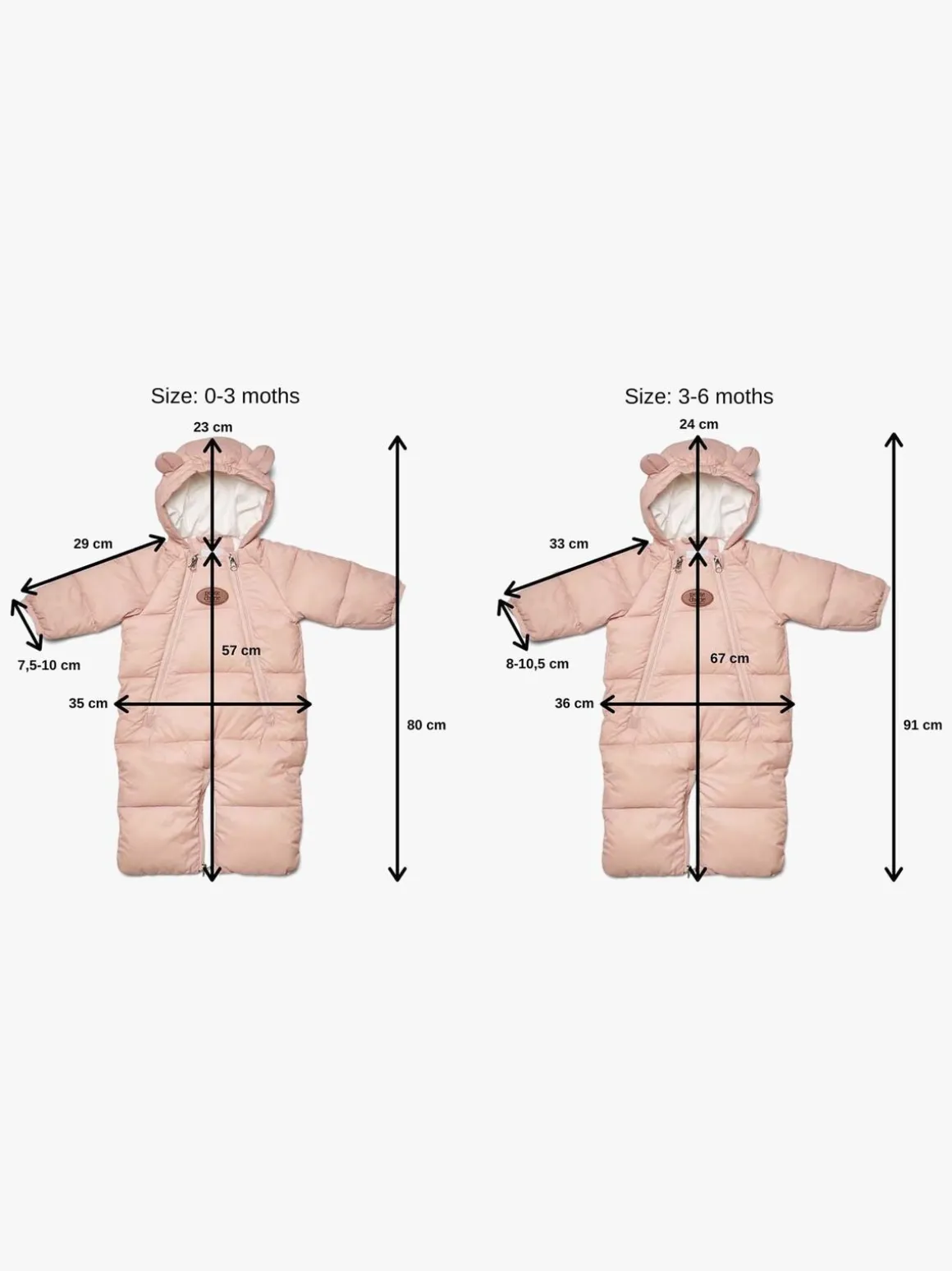 | Øvrige mål | Mål str. 0-3 mdr. Længde inkl. hætte 80 cm Længde ekskl. hætte 57 cm Bredde 35 cm Mål str. 3-6 mdr. Længde inkl. hætte 91 cm Længde ekskl. hætte 67 cm Bredde 36 cm |