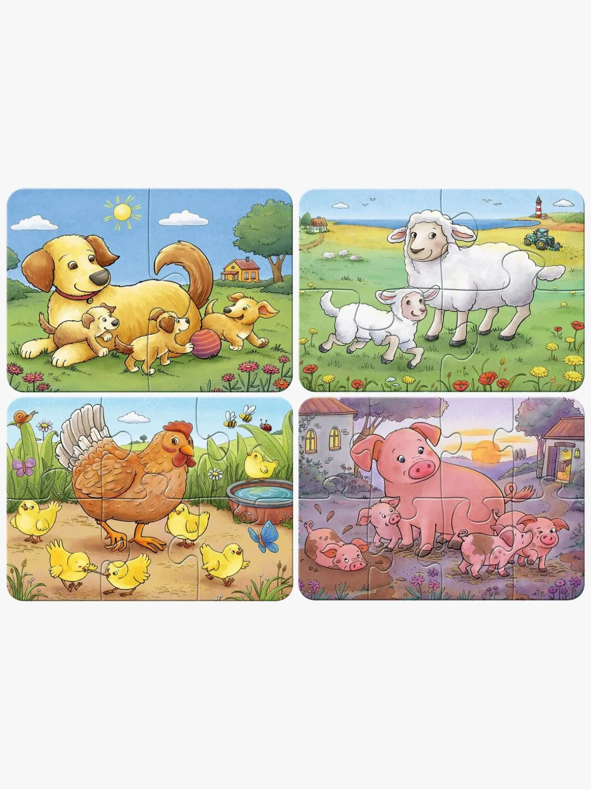 – Indeholder 4 puslespil med 2, 4, 6 og 8 brikker.