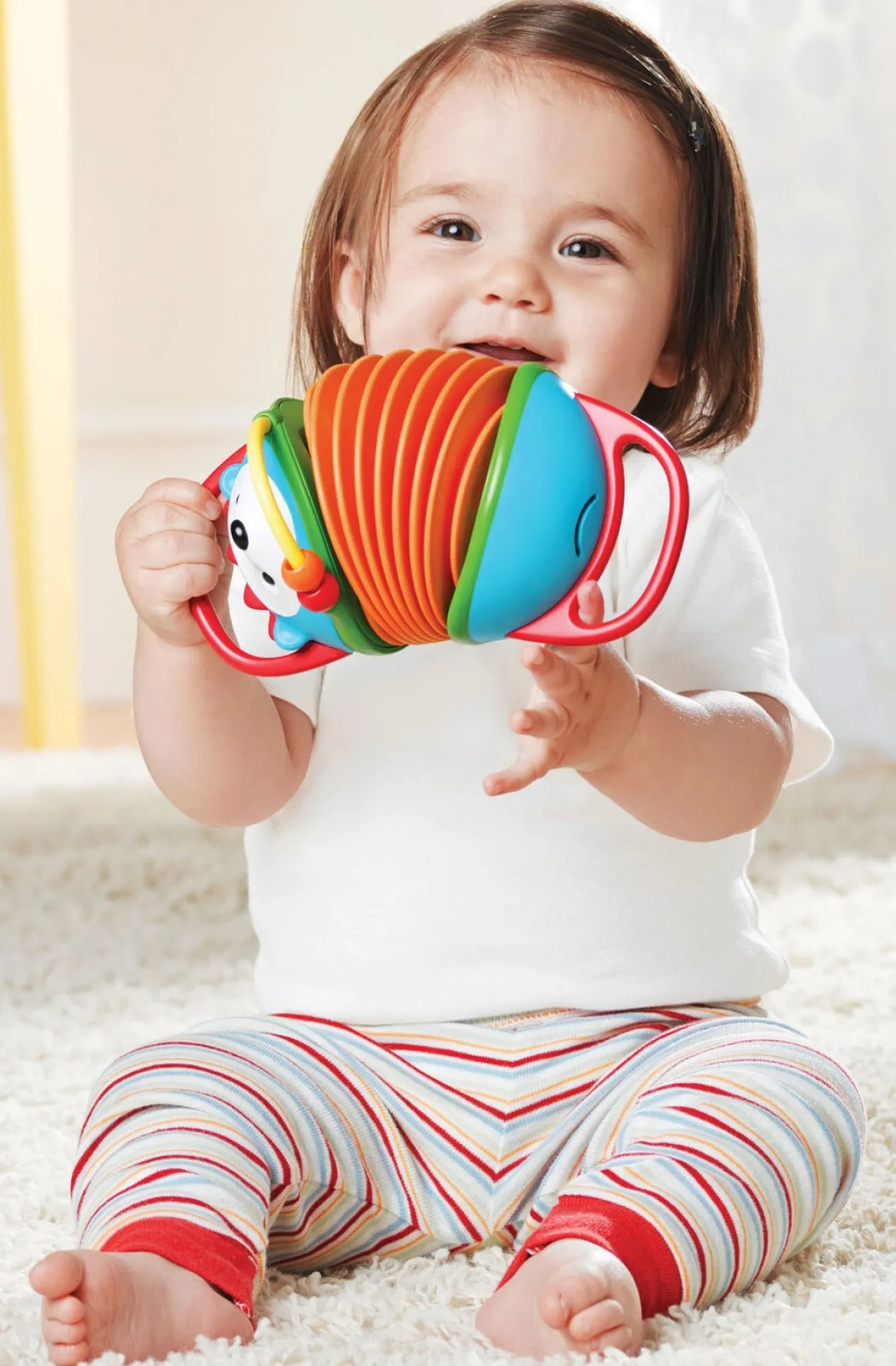 På legetøjet findes både bideringe og perler, hvilket sammen med trækkedelen, hjælper dit barn med at udvikle de motoriske evner.