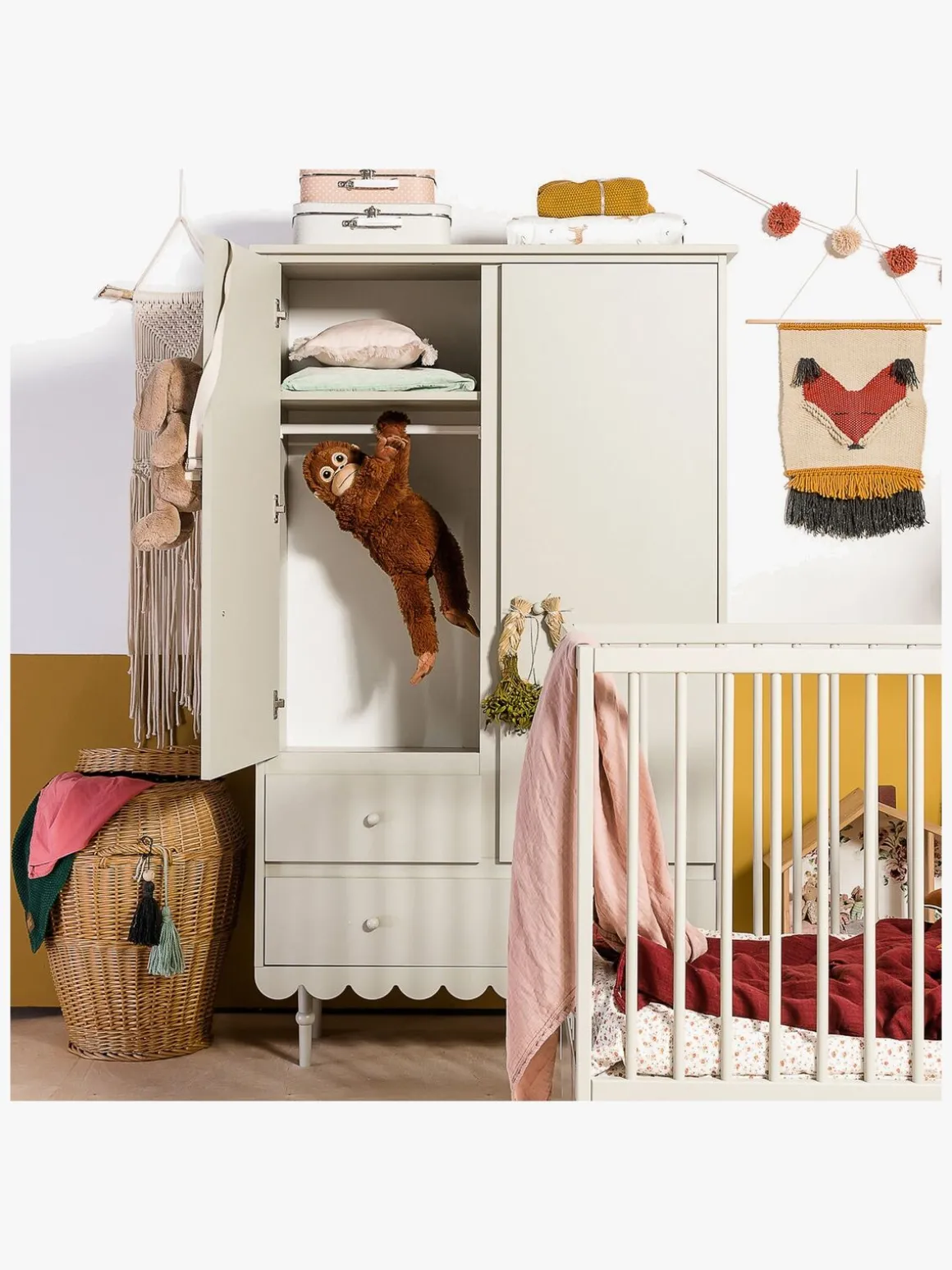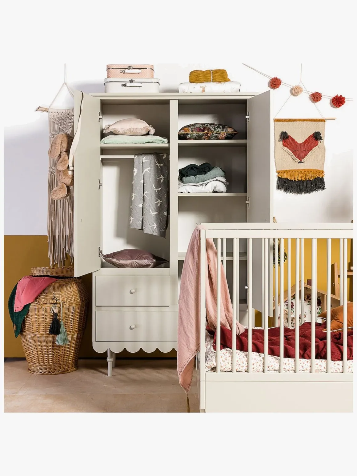 Flot og stilfuldt garderobeskab fra Wood Lucks serie, Babushka. Dette skab har et smukt design med gammeldags charme, der vil passe ind på ethvert børneværelse. Opbevar dit barns tøj med stil i mange år!