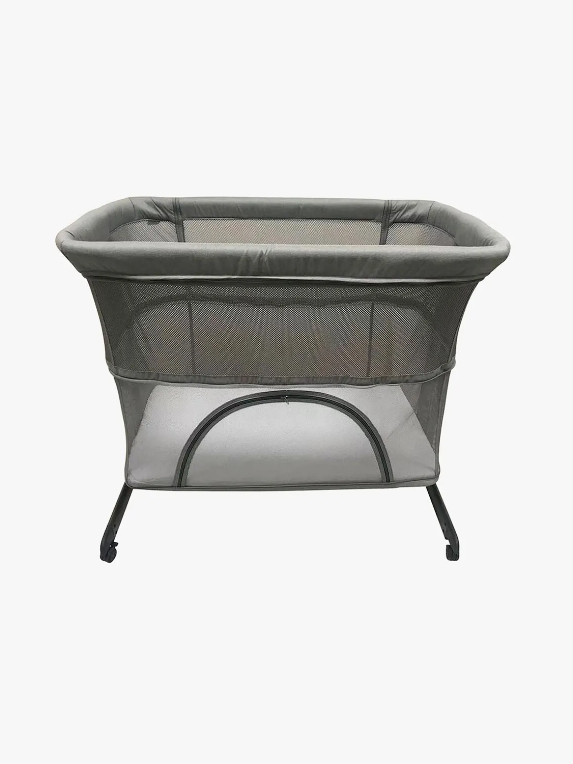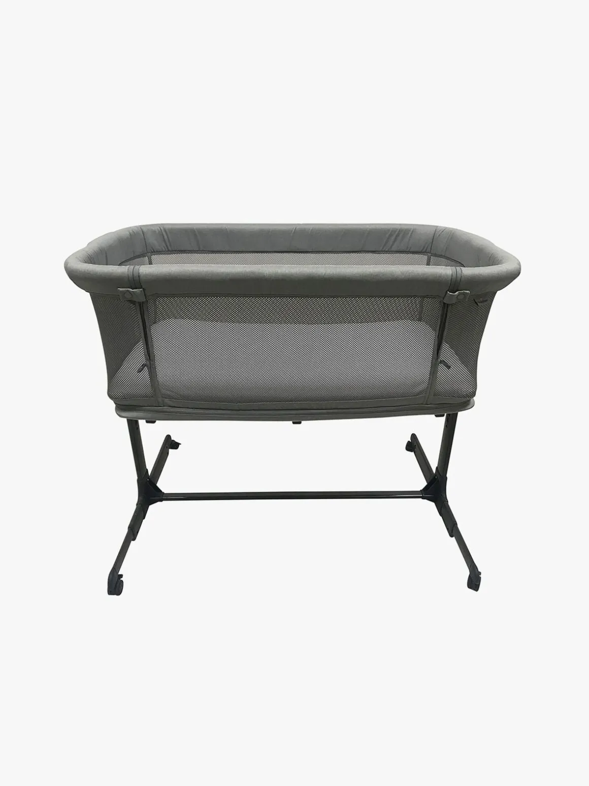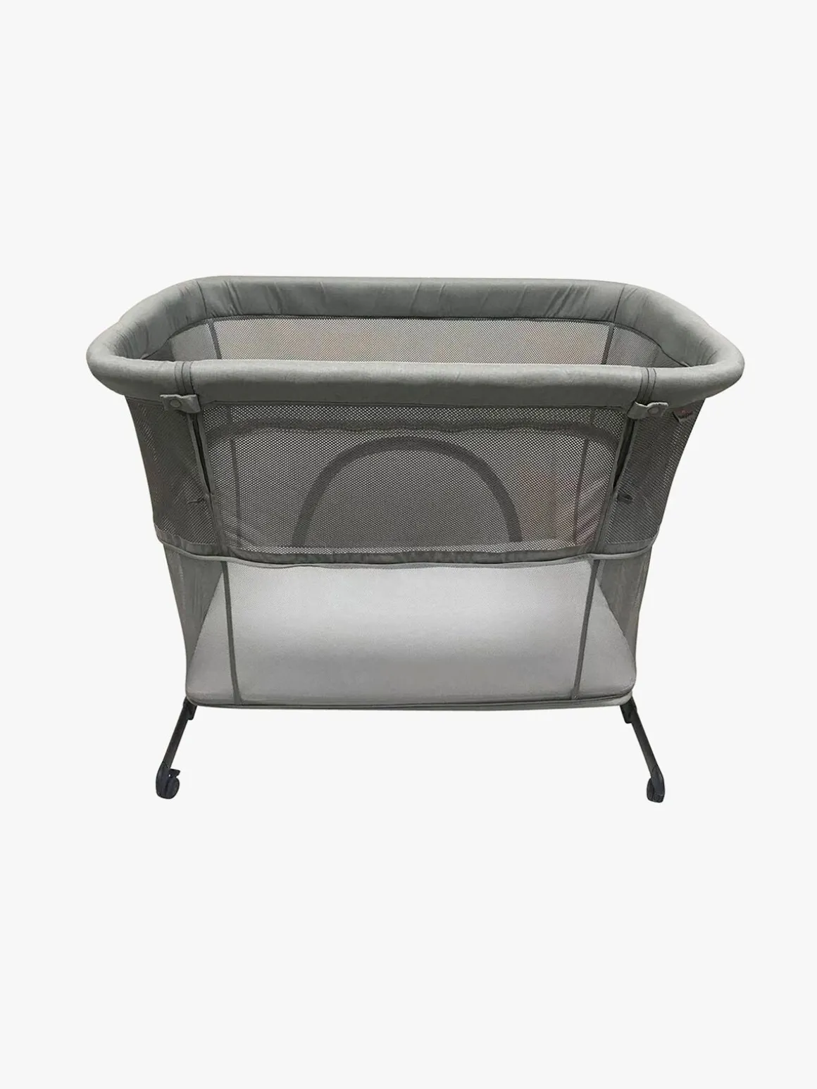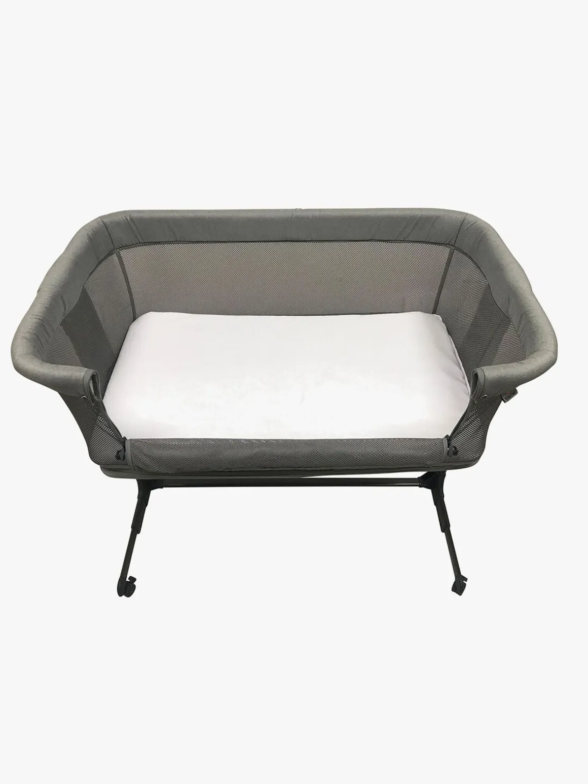 Åbn siden på sengen for at bruge den som bedside crib. Sengen kan højdejusteres og passer til senge med en højde på 58-68 cm. Når det er tid til at lege, kan sengen sænkes så bunden er på samme niveau som gulvet og bruges som kravlegård.