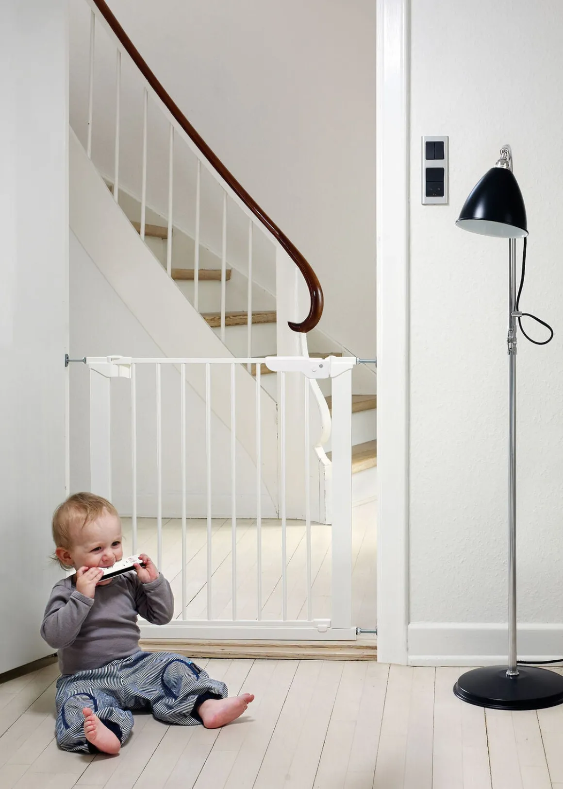 - – BEMÆRK! Vi anbefaler kun at montere spændingslåger i en døråbning eller i bunden af en trappe. På grund af faldrisikoen anbefaler vi, at du i stedet monterer en skruelåge øverst på trappen.