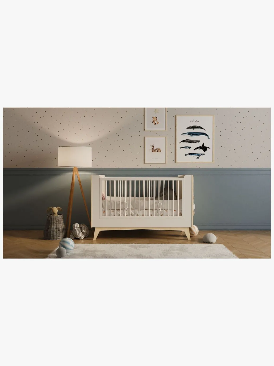 – Tremmeseng med tre niveauer til det voksende barn. Tre av tremmerne kan tages af, så barnet selv kan kravle ind og ud af sengen.
