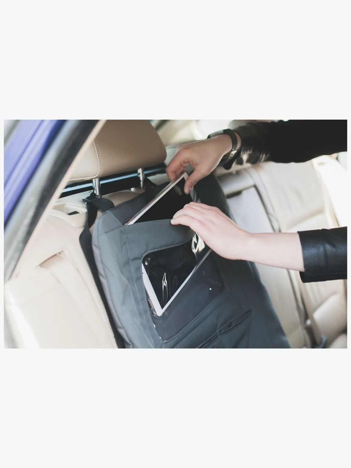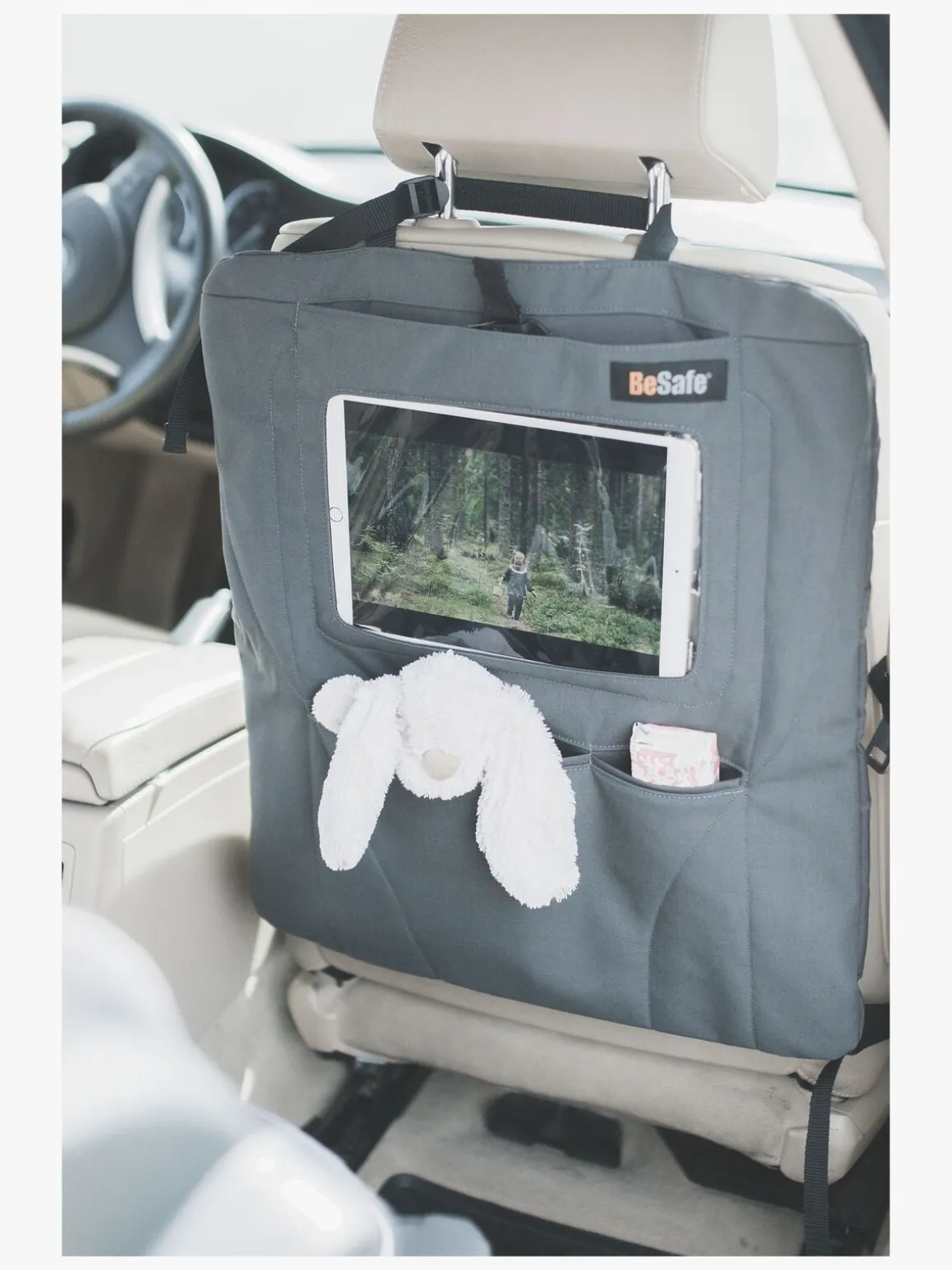 Sædebeskytteren har en smart gennemsigtig lomme til en tablet og små mindre lommer med velcrolukning, hvor der kan blive plads til opbevaring af alle småtingene. Praktisk og smart når hele familien skal på tur!