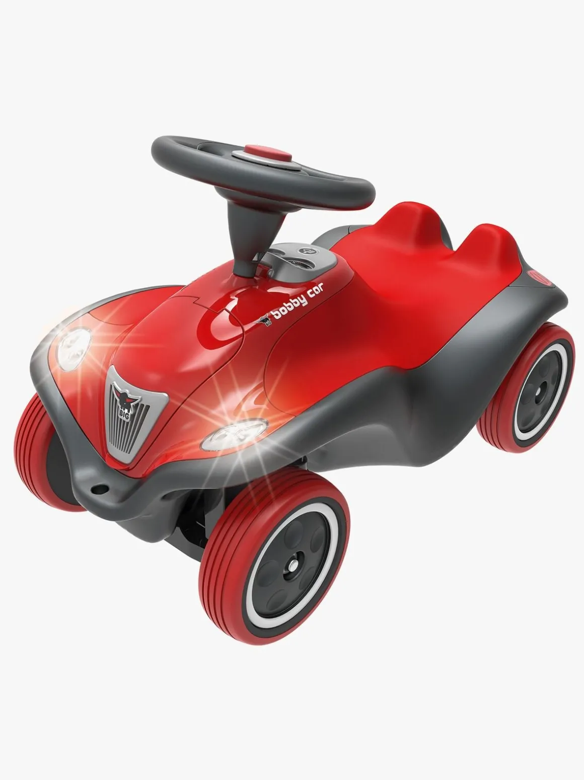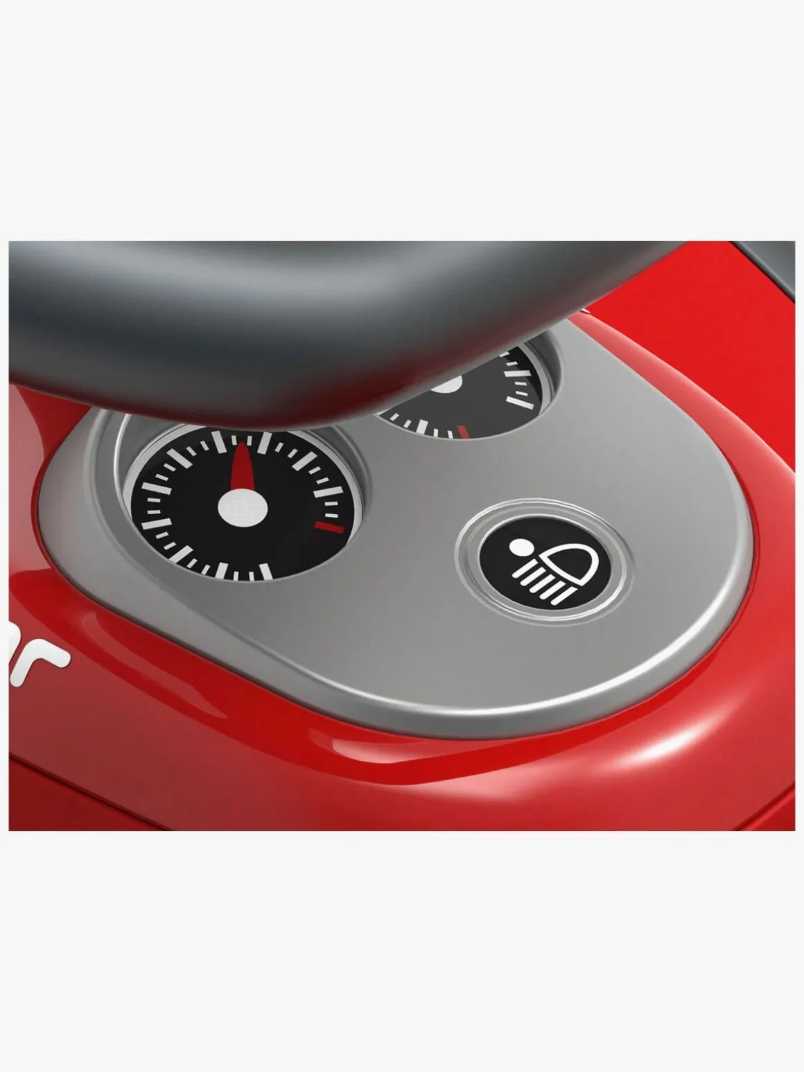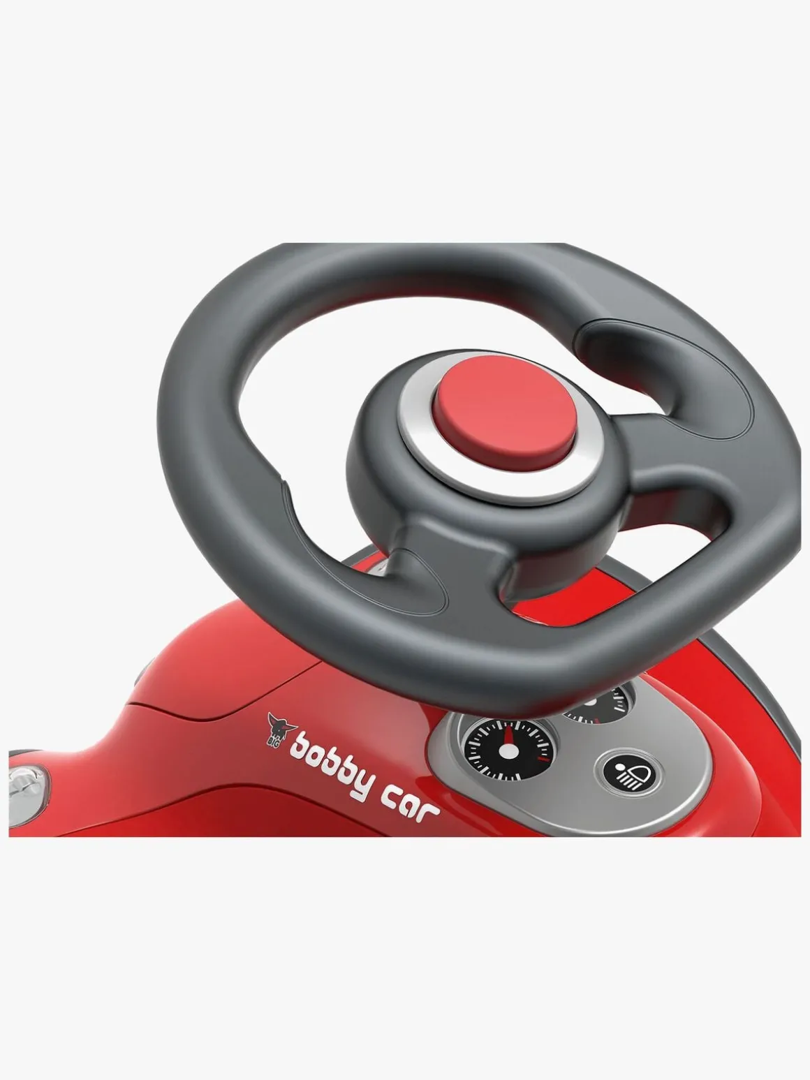 Gør klar til ræs ved at skubbe bilen i gang med fødderne på hver side og skub endnu mere for at køre ekstra hurtigt. Brug rattet til at styre og tryk på hornet, så alle kan høre, at du kører forbi!