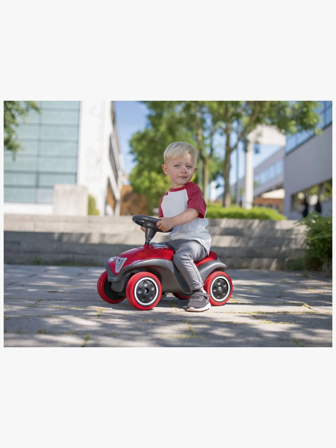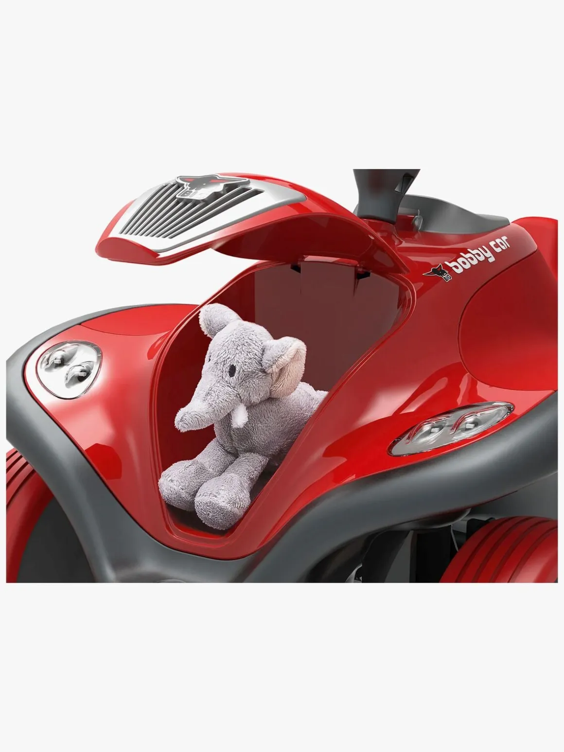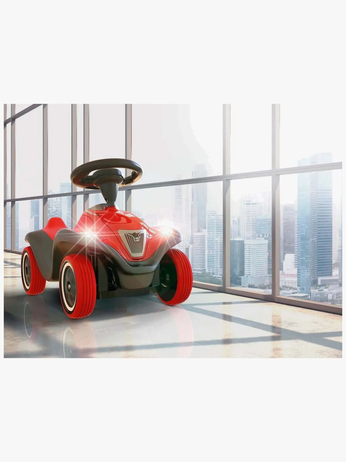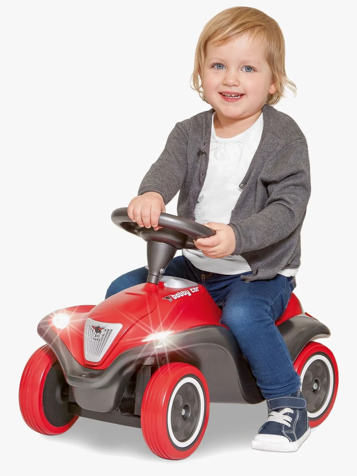 Gør klar til ræs ved at skubbe bilen i gang med fødderne på hver side og skub endnu mere for at køre ekstra hurtigt. Brug rattet til at styre og tryk på hornet, så alle kan høre, at du kører forbi!