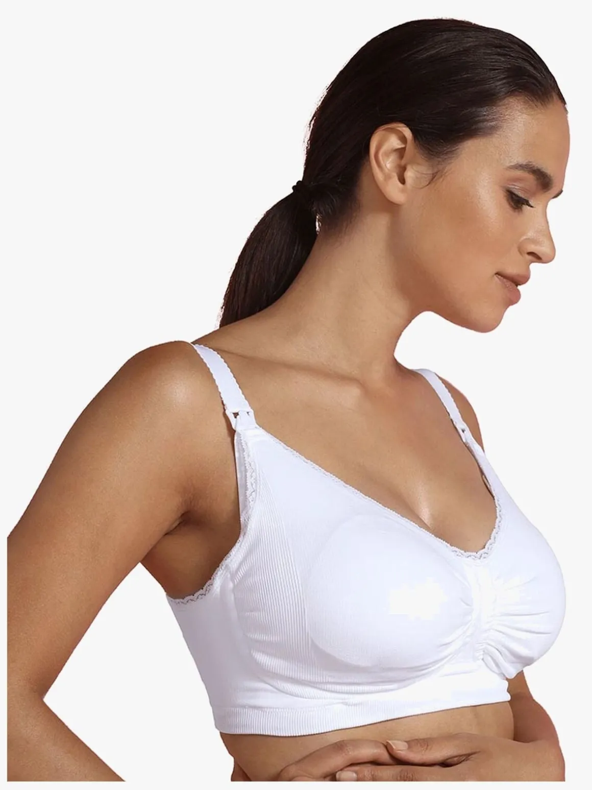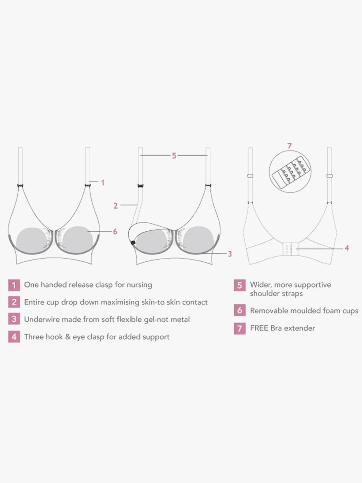 Når du skal amme, kan du åbne ammeåbningen med bare en hånd. For øget fleksibilitet medfølger der en bh-forlænger. Dens dybe nedringning sikrer at bh’en sidder diskret under nedringede trøjer.