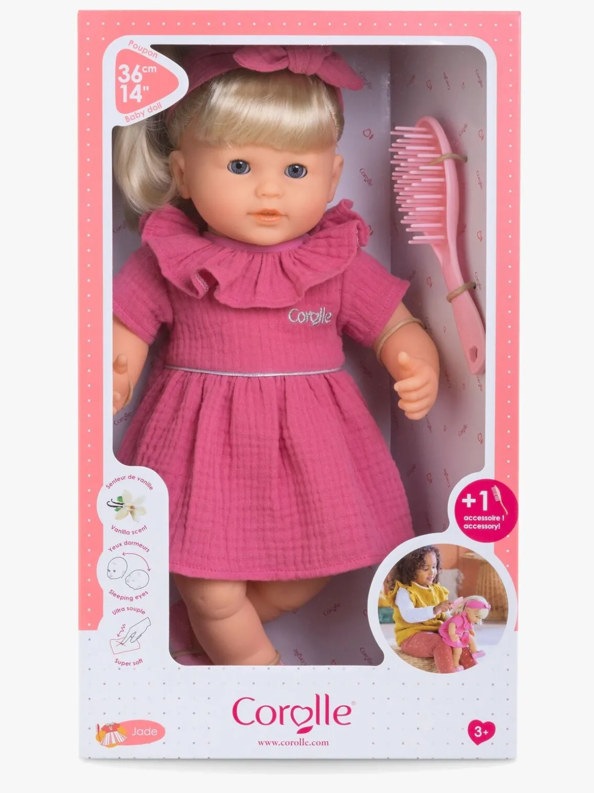– Dukken er klædt i en lyserød kjole, med pandebånd og matchende ballerinasko.